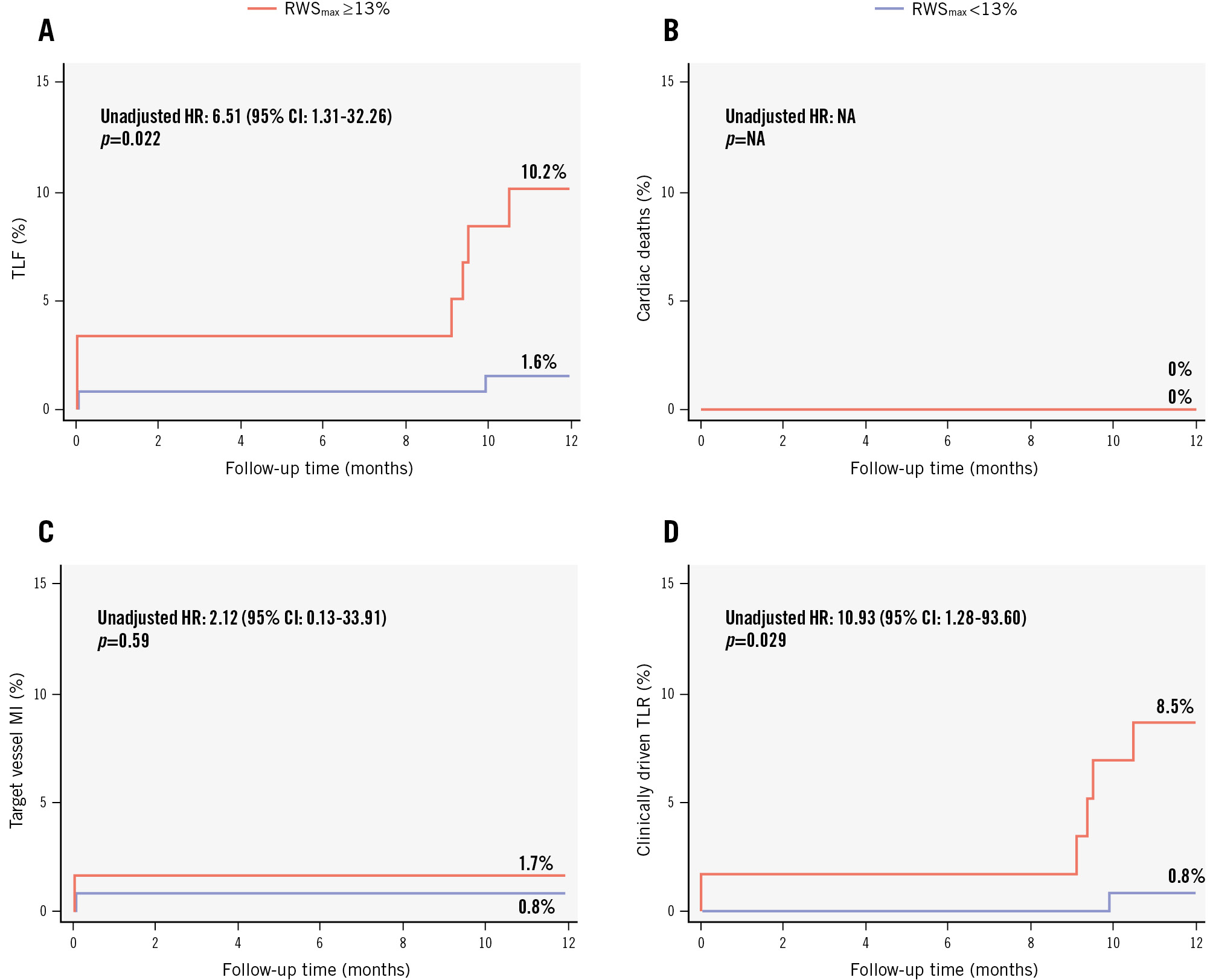 Figure 2. Event curves for lesion-related events in lesions with and without RWSmax ≥13% in the DCB group. A) TLF; (B) cardiac deaths; (C) target vessel MI; and (D) clinically driven TLR. TLF was defined as the composite of cardiac death, target vessel myocardial infarction, and clinically driven TLR. CI: confidence interval; DCB: drug-coated balloon; HR: hazard ratio; MI: myocardial infarction; NA: not applicable; RWSmax: maximum radial wall strain; TLF: target lesion failure; TLR: target lesion revascularisation