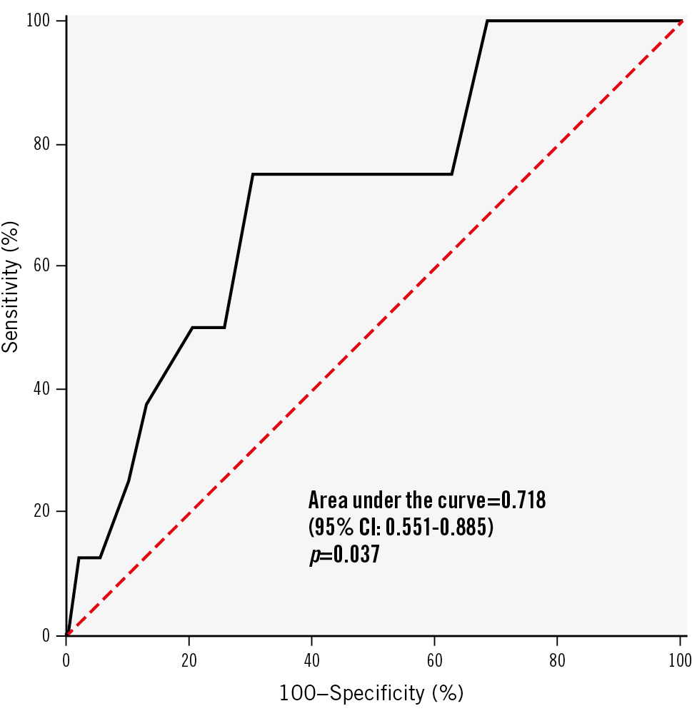 Figure 3. Receiver operating characteristic curve analysis. The area under the curve was 0.718 (95% CI: 0.551-0.885; p=0.037) for RWSmax. TLF was defined as the composite of cardiac death, target vessel MI, and clinically driven TLR. CI: confidence interval; MI: myocardial infarction; RWSmax: maximum radial wall strain; TLF: target lesion failure; TLR: target lesion revascularisation