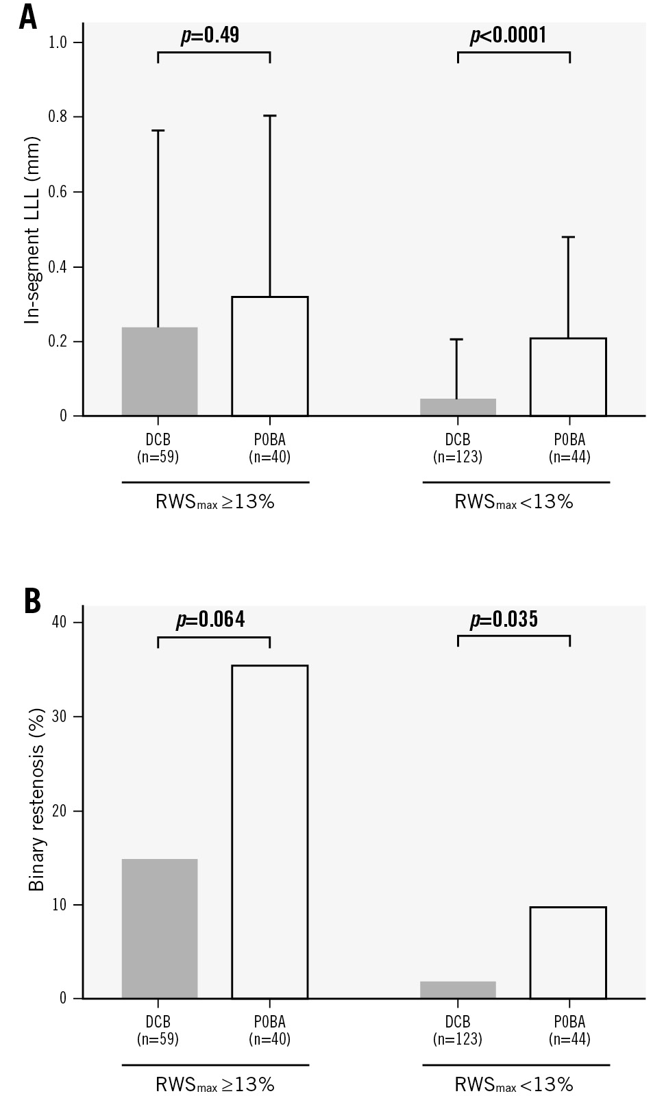 Results: A total of 152 and 72 lesions in the DCB and POBA groups, respectively, completed the 9-month angiographic follow-up. In the DCB group, lesions with RWSmax ≥13% had higher in-segment LLL (0.24±0.53 mm vs 0.05±0.16 mm; p=0.0009), greater binary restenosis (14.9% vs 1.9%; p=0.0040) and more target lesion failure (10.2% vs 1.6%; p=0.022) than those with RWSmax <13%. Among all the lesions with RWSmax ≥13%, no significant difference was observed in in-segment LLL (0.24±0.53 mm vs 0.32±0.48 mm; p=0.49) between the DCB and POBA groups.