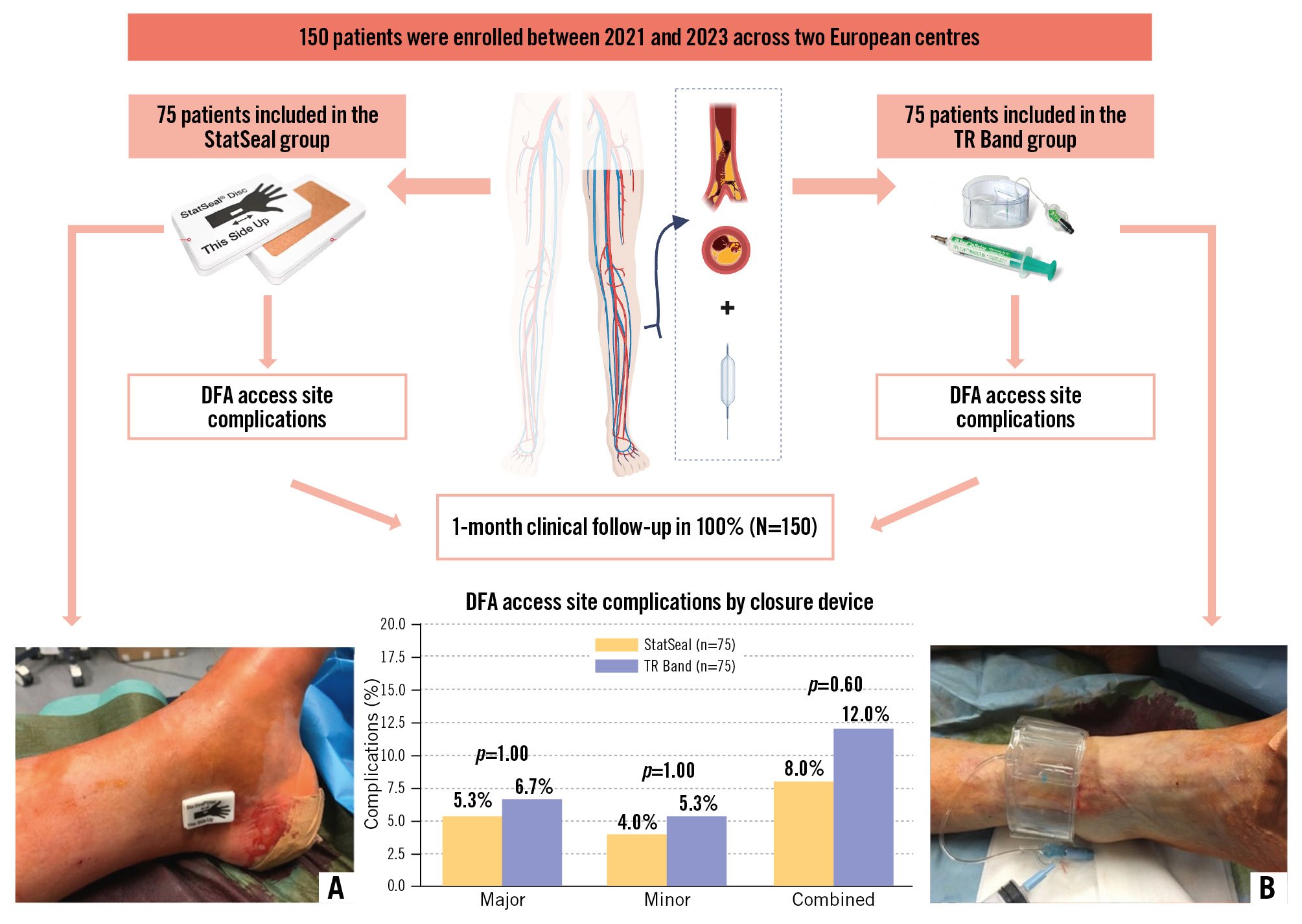 This is the first randomised trial comparing TR Band and StatSeal for DFA access site closure after endovascular intervention. Complication rates were similar (any: 12.0% TR Band vs 8.0% StatSeal; p=0.60; major: 6.7% TR Band vs 5.3% StatSeal; p=1.00; minor: 5.3% TR Band vs 4.0% StatSeal; p=1.00). The study was not powered to detect small between-group differences; therefore, numerical differences should be interpreted cautiously. Compared to prior studies, our results align with the low bleeding complication rates reported for DFA access34.