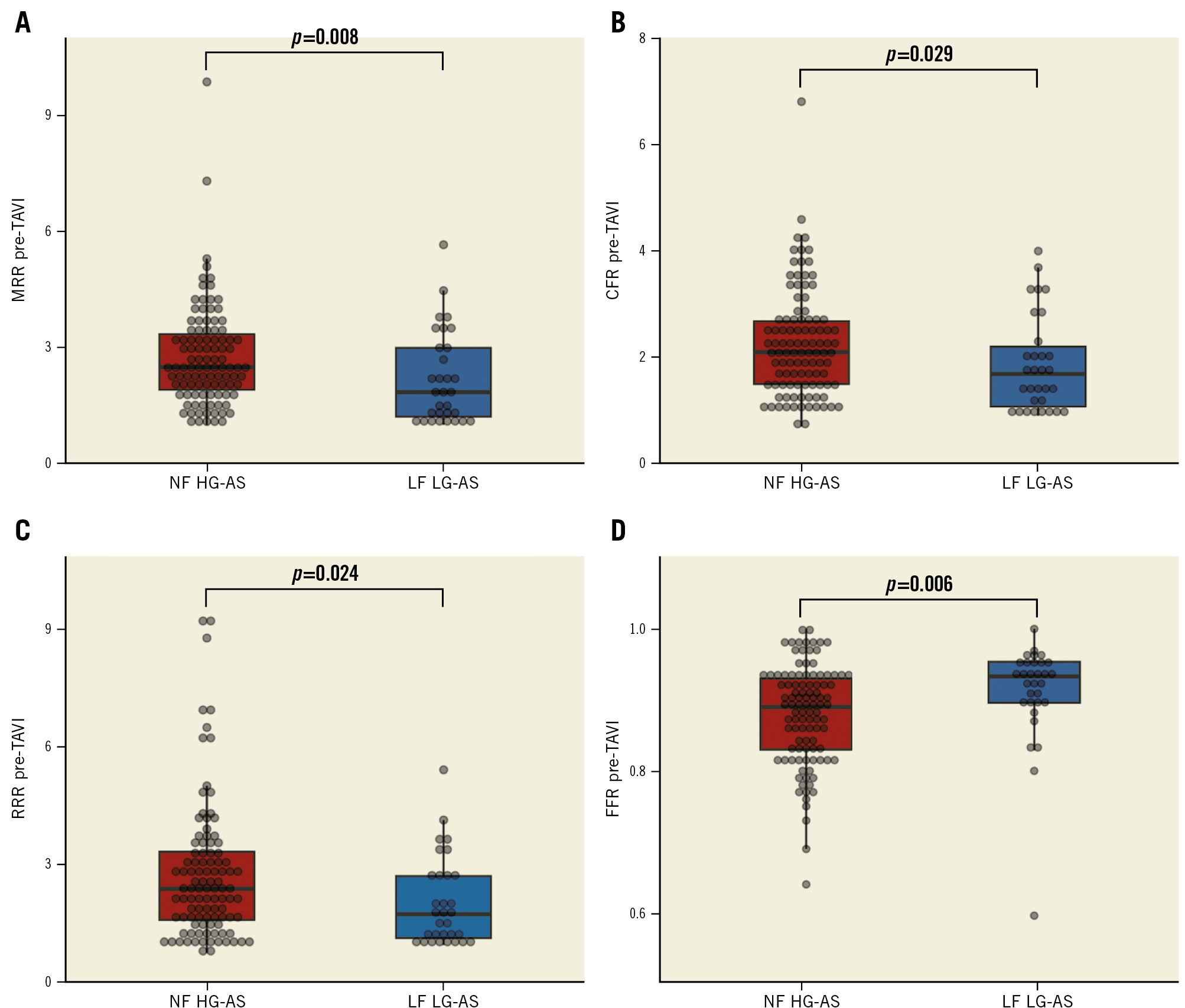 Thirty-one patients (23.1%) were classified as LF LG-AS. The clinical, echocardiographic, procedural, and physiological data of patients stratified according to the AS phenotype are presented in Table 3. MRR (median 1.85 [1.20-3.04] vs 2.50 [1.87-3.40]; p=0.008), RRR (median 1.80 [1.17-2.86] vs 2.45 [1.64-3.42]; p=0.024) and CFR (median 1.69 [1.06-2.30] vs 2.10 [1.50-2.68]; p=0.029) were significantly lower and FFR was significantly higher (median 0.93 [0.89-0.96] vs 0.89 [0.83-0.93]; p=0.006) in patients with LF LG-AS compared with patients with normal-flow high-gradient AS (Figure 2).