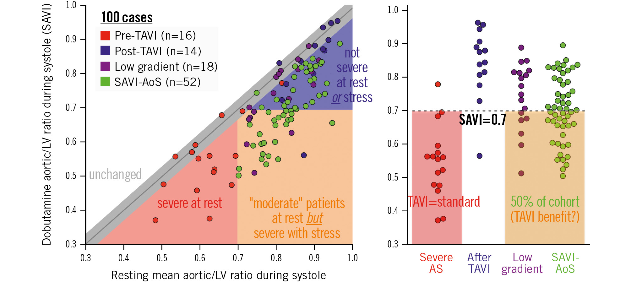 Figure 1. Baseline versus stress valve haemodynamics in SAVI-AoS compared with other cohorts. Red and blue dots are patients from Johnson et al9. Purple dots are patients from Zelis et al11. Green dots are patients from the current cohort. Before transcatheter aortic valve implantation (TAVI; red dots), all subjects except one had an aortic/left ventricular ratio during systole of 0.7 or less. After TAVI (blue dots), all patients except one had a stress aortic/left ventricular systolic pressure ratio (stress aortic valve index [SAVI]) greater than 0.7. In moderate aortic stenosis patients (green dots), 48% of the patients exhibited severe aortic stenosis physiology (comparable with red dots) during stress. The cutoff of 0.70 predicted aortic valve replacement within 1 year and over the entire follow-up (area under the curve 0.74); this cutoff is numerically the same SAVI threshold as that seen in a previous study9. AS: aortic stenosis; LV: left ventricular