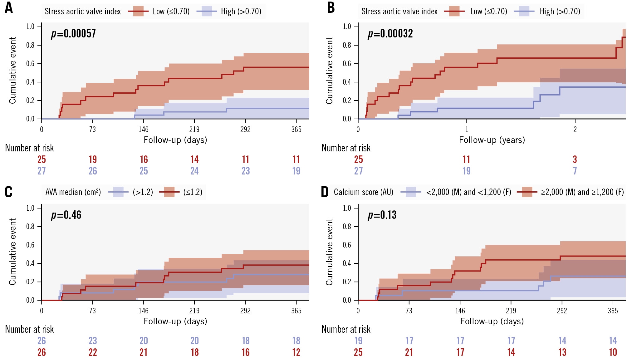 Figure 2. Kaplan-Meier curves. A) Occurrence of aortic valve replacement/intervention (AVR) within 1 year based on the stress aortic valve index (SAVI; cutoff of 0.70). B) Occurrence of AVR during extended follow-up based on the SAVI cutoff of 0.70. C) AVR within 1 year based on the median aortic valve area (AVA). D) AVR within 1 year based on the sex-based calcium score. AU: Agatston units; F: females; M: males