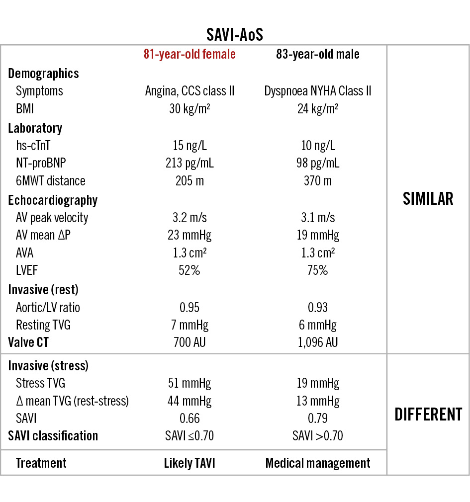 Figure 3. An example of two SAVI-AoS patients. Despite similar baseline characteristics (demographics, laboratory values, echocardiographic metrics, valvular calcium score, and invasive resting metrics), the stress assessment differed completely. While the patient on the left would likely benefit from transcatheter aortic valve implantation, the other patient (right) should simply be followed clinically. ΔP: aortic valve pressure gradient; 6MWT: six-minute walk test; AU: Agatston units; AV: aortic valve; AVA: aortic valve area; BMI: body mass index; CCS: Canadian Cardiovascular Society; CT: computed tomography; hs-cTnT: high-sensitivity cardiac troponin T; LV: left ventricular; LVEF: left ventricular ejection fraction; NT-proBNP: N-terminal pro-B-type natriuretic peptide; NYHA: New York Heart Association; SAVI: stress aortic valve index; TAVI: transcatheter aortic valve implantation; TVG: transvalvular gradient