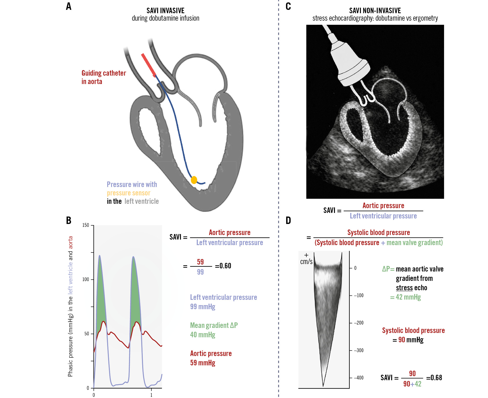 Central illustration. What is the SAVI? A) Invasive set-up, annotated. B) Example illustrating the calculation of the stress aortic valve index (SAVI) during invasive aortic valve assessment with the use of dobutamine. C) Non-invasive set-up. D) An example where the SAVI is calculated with the use of bicycle stress ergometry (same calculation when using dobutamine stress echocardiography). ΔP: aortic valve pressure gradient