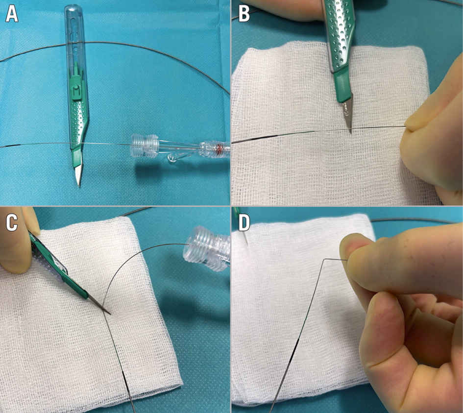 Figure 1. “Flying V” formation. A) Exposing a segment of the guidewire for denudation; (B) denuding a segment of the guidewire using the sharp side of the scalpel blade; (C) bending the denuded segment of the guidewire using the back side of the scalpel blade; (D) denuded segment forming the “flying V”.