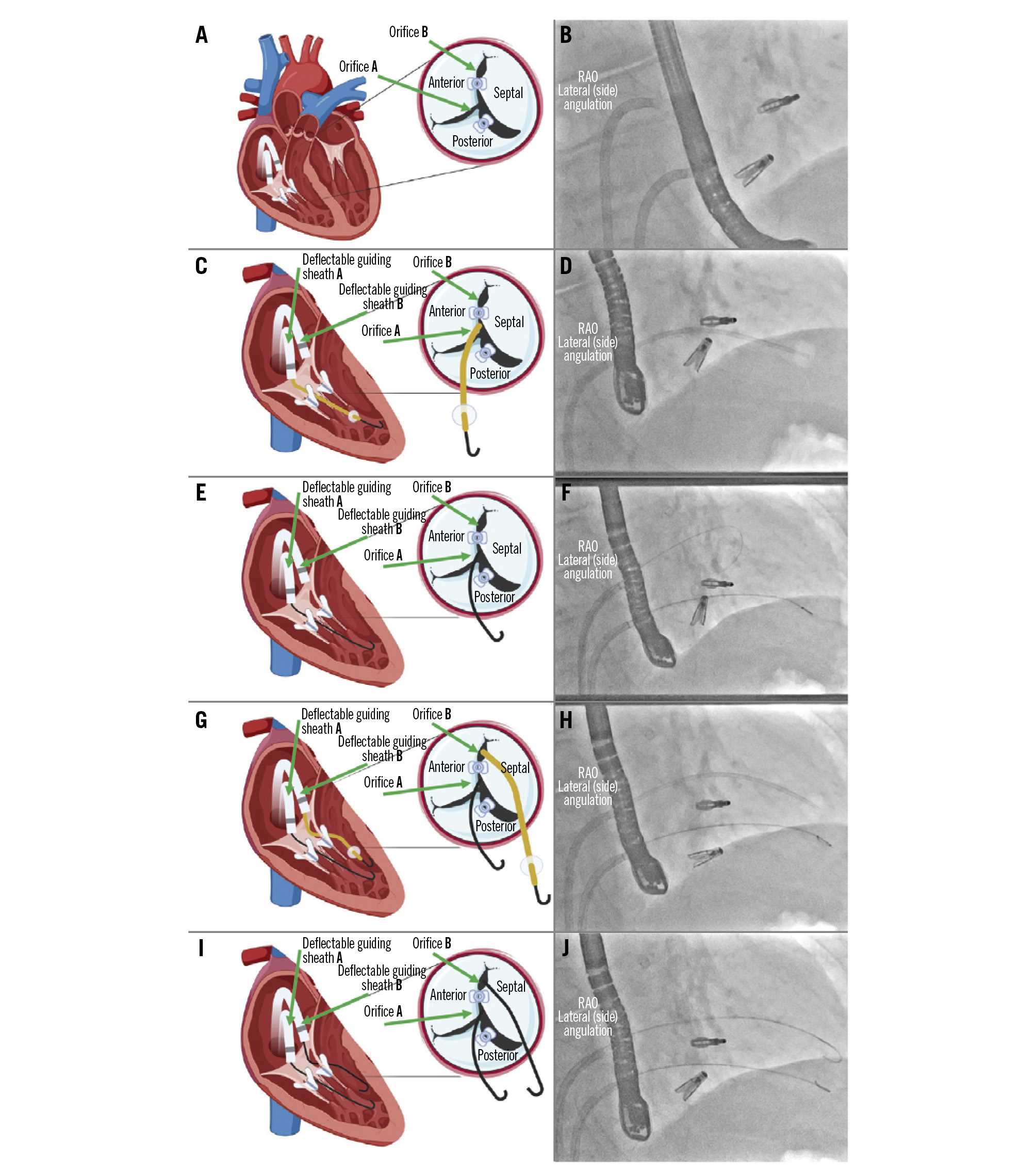Figure 2. Tricuspid valve passage. A) Diagram of the tricuspid valve showing the target orifices for making the loop: orifice “B” (at the level of the anteroseptal commissure) and orifice “A” (between the septal and posterior leaflets); (B) angiographic view in the lateral (side) angulation showing 2 deflectable guiding sheaths in the working position and the 2 clips; (C) through the deflectable guiding sheath “A”, use a wedge catheter for crossing orifice “A”; (D) angiographic view in the lateral (side) angulation showing a wedge catheter crossing the tricuspid valve under the upper clip; (E) exchange of the wedge catheter for a guidewire; (F) angiographic view in the lateral (side) angulation showing one guidewire beneath the top clip and a second guidewire above the top clip; (G) through the deflectable guiding sheath “B”, a wedge catheter is used for crossing orifice “B”; (H) angiographic view in the lateral (side) angulation showing the wedge catheter above the top clip; (I) exchange of both wedge catheters for conventional J-shaped guidewires; (J) angiographic view of the position of both J-shaped standard guidewires. RAO: right anterior oblique