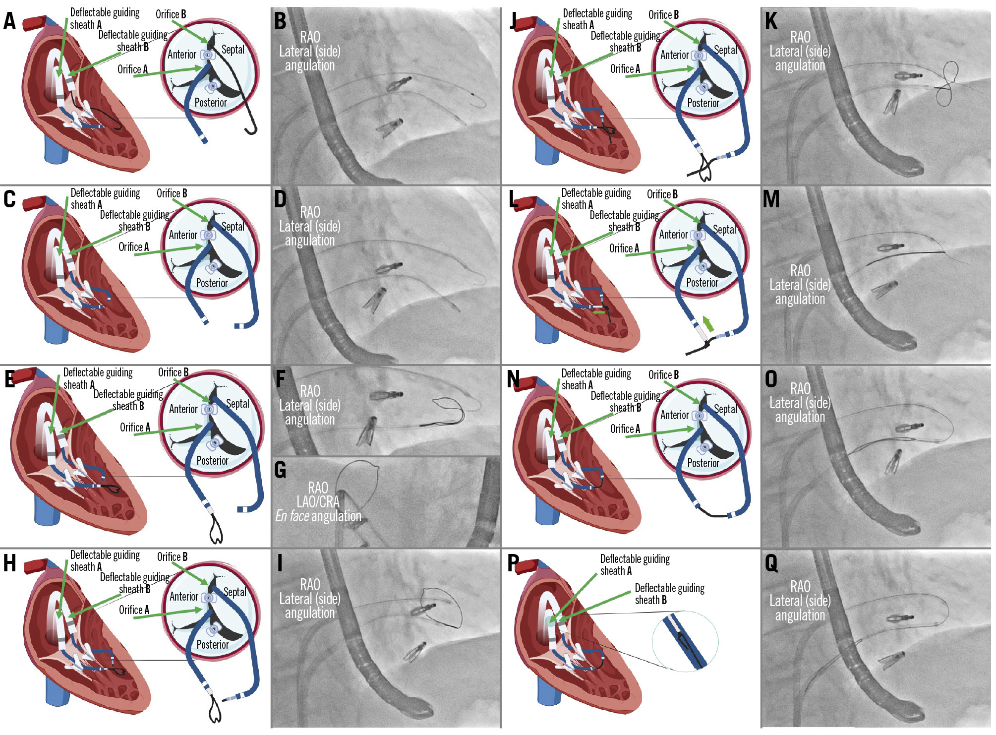 Figure 3. Wire snaring. A) A multipurpose catheter is advanced through orifice “A”; (B) angiographic view of the multipurpose catheter crossing below the upper clip; (C) crossing of orifice “B” using a JR catheter; (D) angiographic view of both catheters after crossing the tricuspid valve; (E) a 20 mm GooseNeck or trilobe snare is advanced through the multipurpose catheter; (F) angiographic view in the lateral (side) angulation showing the snare coming out from the multipurpose catheter; (G) angiographic view in the en face angulation pointing the snare upwards; (H) advancement of a coronary microcatheter through the JR catheter; (I) angiographic view in the lateral (side) angulation with the snare coming out of the multipurpose (lower catheter) and the microcatheter at the tip of the JR catheter (upper catheter); (J) diagram showing the Astato wire crossing the snare; (K) angiographic view of the Astato wire crossing the loop of the snare; (L) snaring and fixation of the Astato wire; (M) angiographic view showing the snaring of the Astato wire; (N) the snared wire is pulled into the multipurpose catheter; (O) angiographic view of the introduction of the Astato wire into the multipurpose catheter; (P) ensure the wire is fixed with the snare and is introduced into the multipurpose wire for more support; (Q) angiographic view of the rail formation after introduction of the Astato wire into the multipurpose catheter. CRA: cranial; JR: Judkins Right; LAO: left anterior oblique; RAO: right anterior oblique