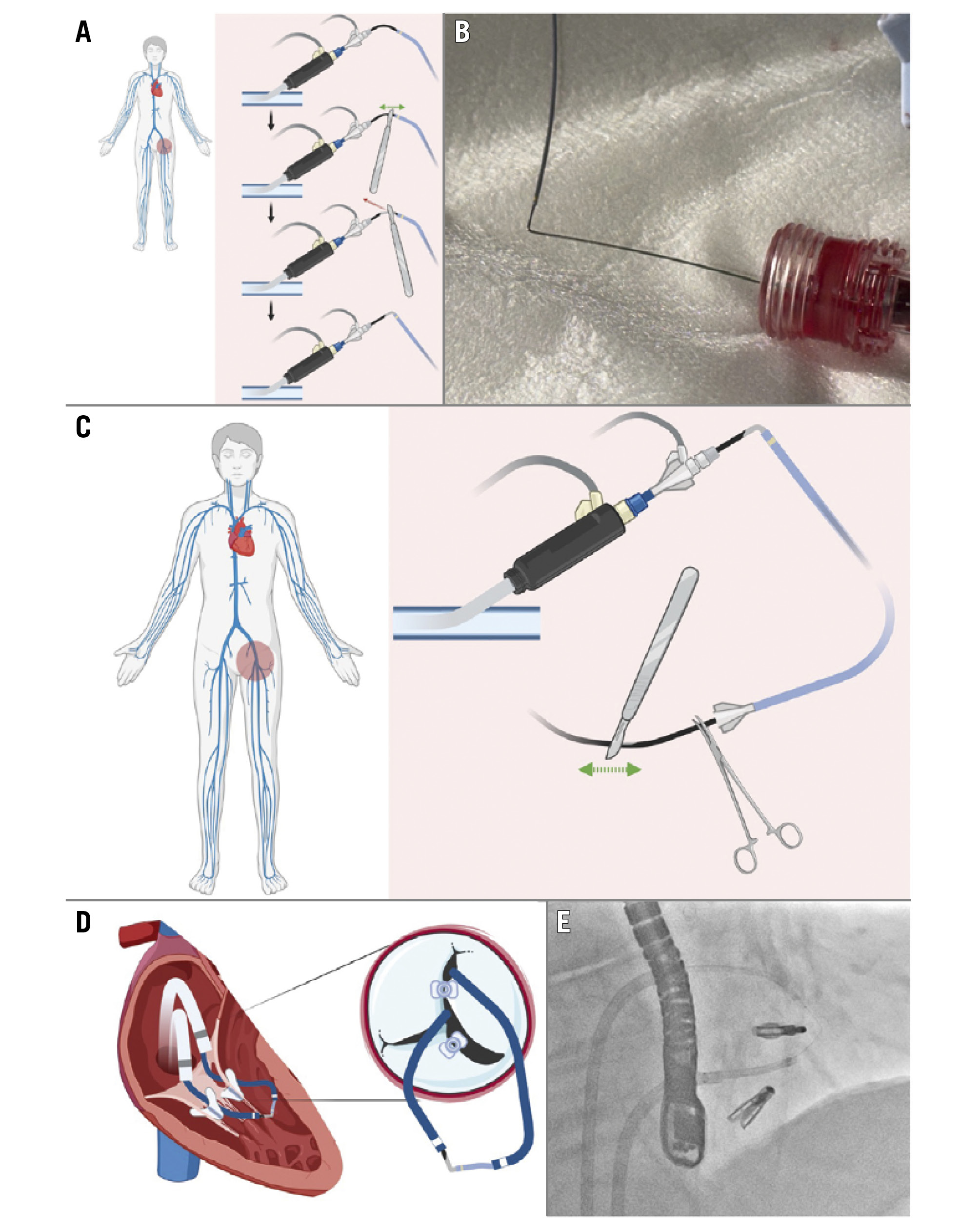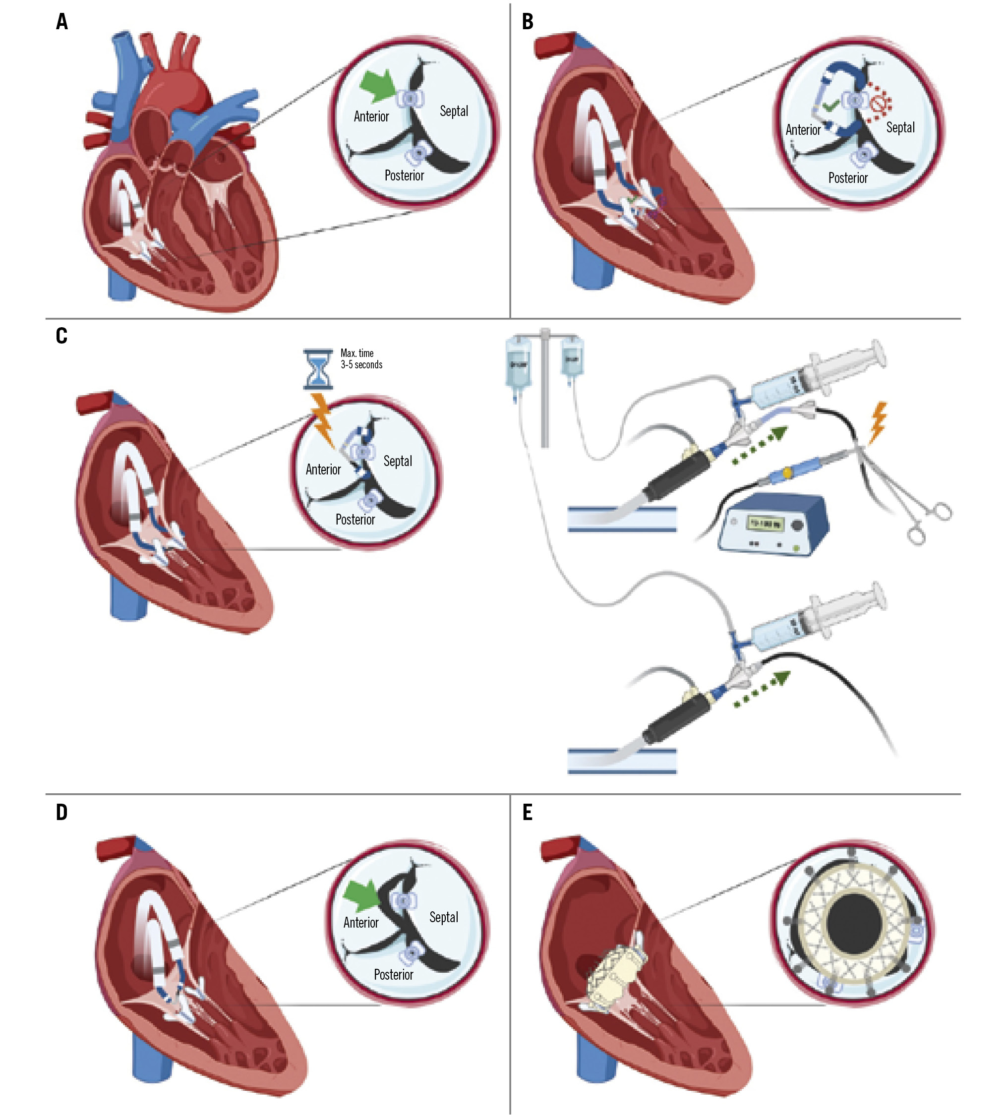 Central illustration. ELASTA-T: Electrosurgical laceration of tricuspid edge-to-edge repair. A) Diagram showing the tricuspid valve and the position of the clip to be detached (green arrow) grasping the anteroseptal leaflets, with a second clip attached only to the posterior leaflet; (B) “flying V” formed with an Astato wire positioned at the lateral side of the clip to be detached (anterior leaflet); (C) laceration of the leaflet using electrocautery settled at 70-100 W in “cut” mode for 3-5 seconds while pulling both catheters and flushing with dextrose simultaneously; (D) confirmation of the anterior leaflet laceration (green arrow); (E) final result after tricuspid valve implantation.