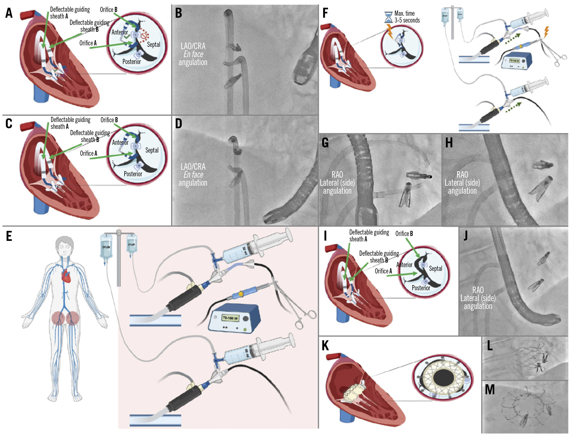 Figure 5. Leaflet laceration. A) Diagram showing confirmation of the “flying V” in the correct position at the lateral side of the clip to be detached (anterior leaflet); (B) angiographic view in the en face angulation showing the position of the loop at the lateral side of the clip; (C) appropriate microcatheter tip-to-kink distance and position should be maintained; (D) angiographic view in the en face angulation confirming the position of the loop after creating tension by pulling back the catheters; (E) the electrosurgery pencil is connected at the distal denuded part of the Astato wire and fixed with a clamp; the electrosurgery generator is set to “pure cut” mode at 70-100 W; two 50 mL syringes are directly connected to a 3-way stopcock and filled with dextrose solution; (F) while using electrocautery in “cut” mode for 3-5 seconds, both catheters and the externalised wire are pulled back and the dextrose solution is injected simultaneously; (G) confirmation of the “flying V” form in position in the lateral (side) view; (H) angiographic leaflet laceration view after electrocautery is switched off in the lateral (side) view; (I) diagram showing the single leaflet attachment of the clip attached only to the septal leaflet, with the lacerated leaflet (anterior); (J) angiographic view in the lateral (side) angulation showing the remaining loop after laceration; (K) diagram showing the implanted tricuspid valve after leaflet laceration with both clips pushed to the sides of the valve; angiographic views in the lateral (side; L) and en face angulations (M), showing the final fluoroscopic result after tricuspid valve implantation. CRA: cranial; JR: Judkins Right; LAO: left anterior oblique; RAO: right anterior oblique
