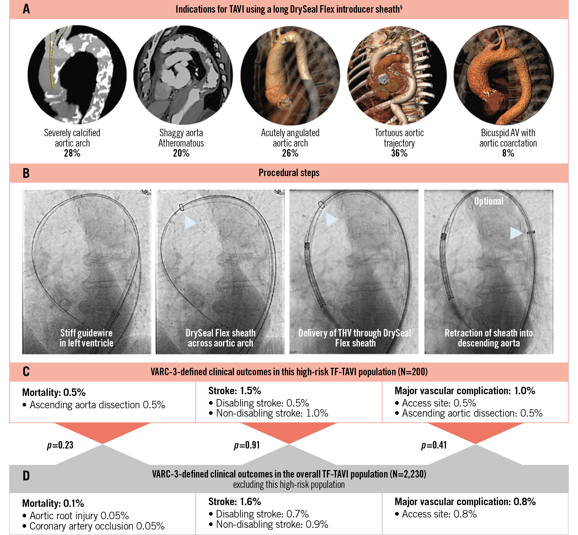 Figure 1. Use of an extended-length introducer sheath for TF-TAVI with self-expanding valves in hostile aortic anatomies. Indications (A), procedural steps (B) and VARC-3-defined clinical outcomes in a patient cohort of 200 patients with a hostile aortic anatomy treated by TF-TAVI using a long DrySeal Flex introducer sheath (C). These outcomes were compared with standard TF-TAVI cases in which a conventional approach was used (D). §One patient can have more than one indication. AV: aortic valve; TAVI: transcatheter aortic valve implantation; TF: transfemoral; THV: transcatheter heart valve; VARC: Valve Academic Research Consortium