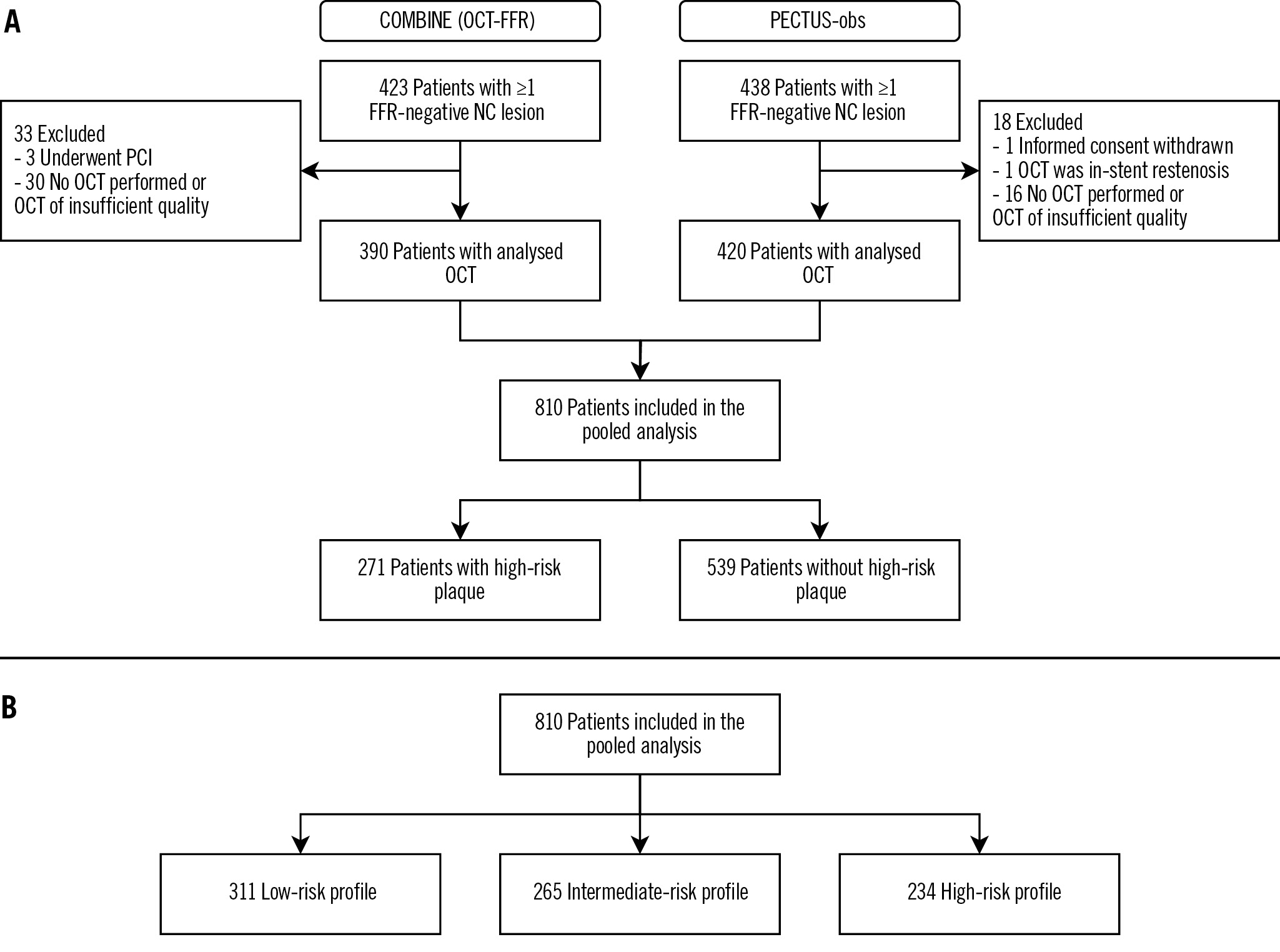 Figure 1. Study flowchart. Study flowchart for the presence of a high-risk plaque (A) and for the classification of patients into clinical risk profiles (B). FFR: fractional flow reserve; NC: non-culprit; OCT: optical coherence tomography; PCI: percutaneous coronary intervention