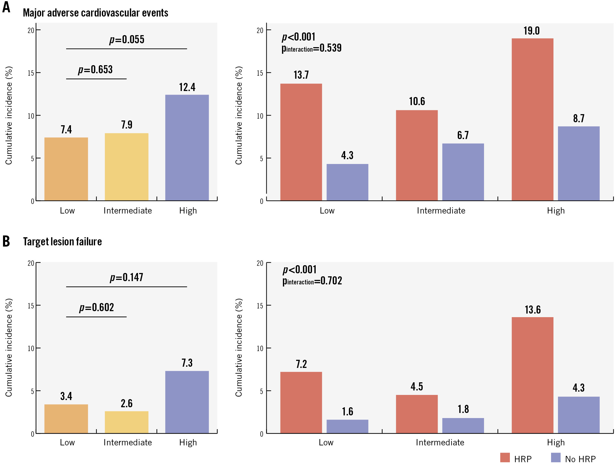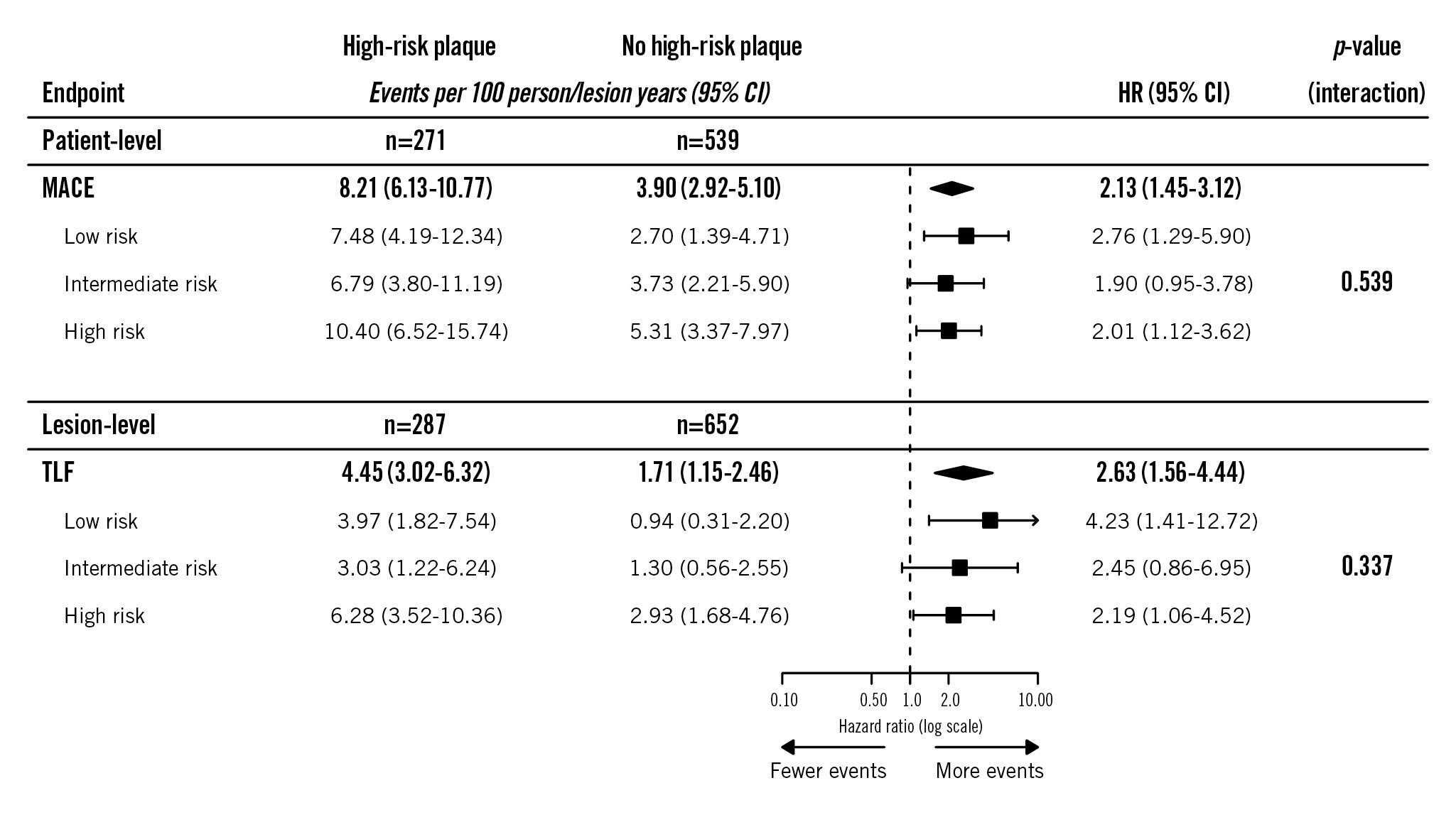 Results: Among 810 patients, 311, 265, and 234 were at low (TRS-2P 0-1), intermediate (TRS-2P 2), and high risk (TRS-2P ≥3), respectively. The modified TRS-2P had no discriminative value for the identification of patients with an HRP (area under the receiver operating characteristic curve 0.51, 95% confidence interval [CI]: 0.47-0.56). A consistent trend towards worse clinical outcome in the presence of an HRP was observed across different clinical risk profiles (pinteraction=0.539 for MACE and 0.337 for TLF). For TLF, the highest event rate per 100 lesion-years was observed in high-risk patients with HRPs (6.28, 95% CI: 3.52-10.36; 13.6% absolute risk at 2 years).