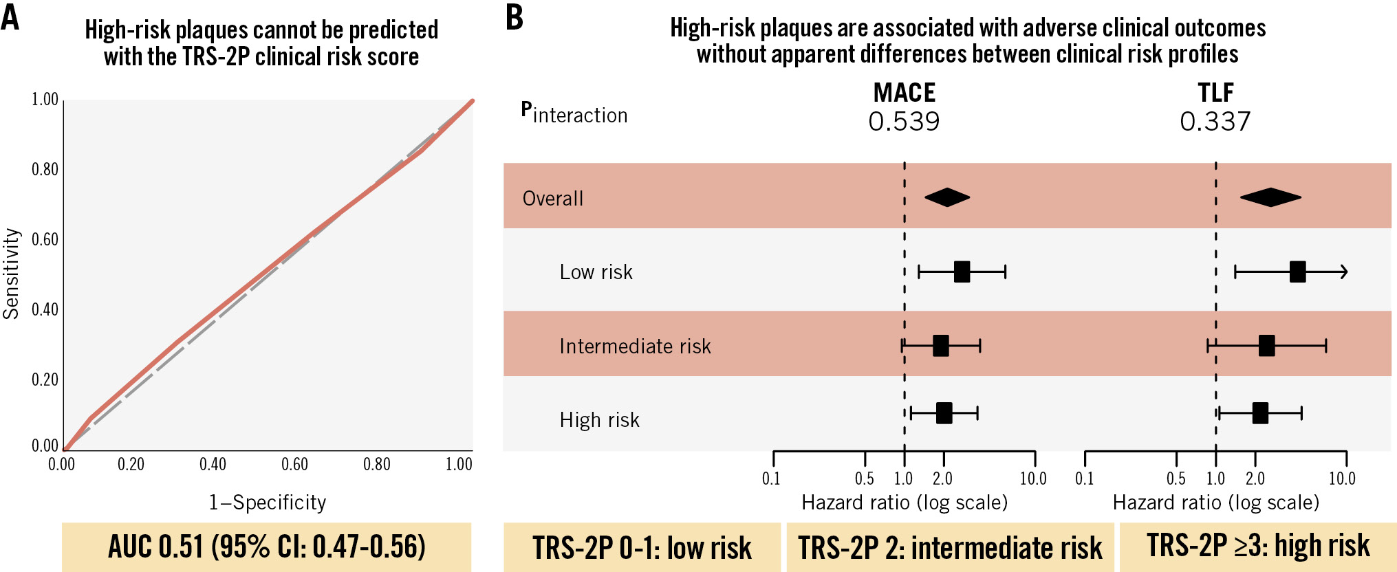 Central illustration. The association between clinical risk factors and the presence and prognostic implications of high-risk plaques. A) AUC curve of the discriminatory value of the number of TRS-2P criteria for the prediction of at least one high-risk plaque. B) Forest plot of the risk associated with the presence of at least one high-risk plaque according to clinical risk profile. AUC: area under the receiver operating characteristic curve; CI: confidence interval; MACE: major adverse cardiovascular events; TLF: target lesion failure; TRS-2P: Thrombolysis in Myocardial Infarction Risk Score for Secondary Prevention