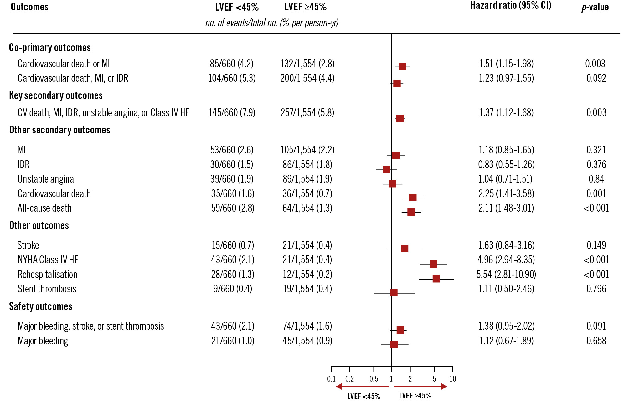 Figure 1. Analysis of the effect of LV function category on clinical outcomes. Clinical outcomes according to baseline LVEF category (LVEF <45% vs ≥45%). Patients with LVEF <45% had a higher incidence of CV death or new MI (4.2%/year vs 2.8%/year; p=0.003), as well as higher rates of NYHA Class IV heart failure and rehospitalisation. This highlights the greater risk among those with reduced LVEF. CI: confidence interval; CV: cardiovascular; HF: heart failure; IDR: ischaemia-driven revascularisation; LVEF: left ventricular ejection fraction; MI: myocardial infarction; NYHA: New York Heart Association