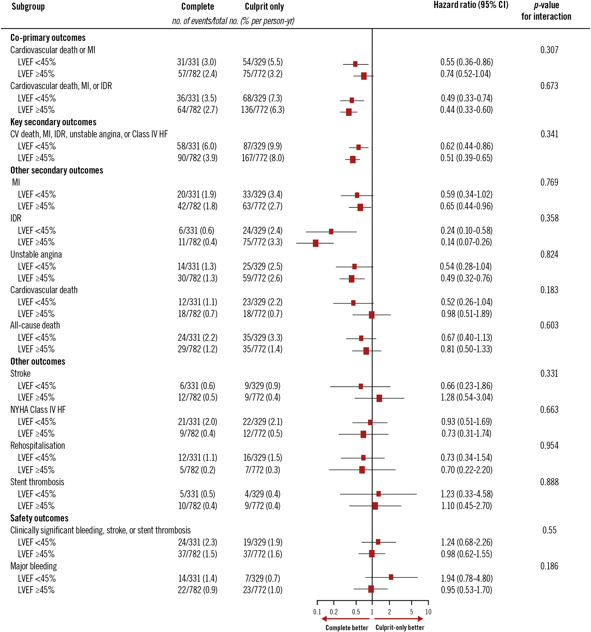 The incidence of the first co-primary outcome of CV death or new MI was higher (4.2%/year vs 2.8%/year; p=0.003) in patients with LVEF <45% than in those with LVEF ≥45% (Central illustration). A similar trend was observed for the second co-primary outcome of CV death, new MI or IDR (5.3%/year vs 4.4%/year; p=0.09). There was also a higher incidence of the key secondary outcomes of cardiovascular death, MI, IDR, unstable angina, or NYHA Class IV heart failure in patients with LVEF <45% than in patients with LVEF ≥45% (7.9%/year vs 5.8%/year; p=0.003). The incidences of CV death (1.6%/year vs 0.7%/year; p<0.001), NYHA Class IV (2.1%/year vs 0.4%/year; p<0.001) and rehospitalisation due to heart failure (1.3%/year vs 0.2%/year; p<0.001) were also higher in patients with LVEF <45% (Figure 1). Among patients with LVEF <45%, the incidence of the first co-primary outcome of CV death or new MI was 3%/ year in the complete revascularisation group versus 5.5%/ year in the culprit lesion-only PCI group (HR 0.55, 95% CI: 0.36-0.86). Of those with LVEF ≥45%, the composite of CV death or new MI occurred at a rate of 2.4%/year in the complete revascularisation group versus 3.2%/year in the culprit lesion-only PCI group (HR 0.74, 95% CI: 0.52-1.04; interaction p=0.31). The second co-primary outcome of CV death, new MI, or IDR occurred at 3.5%/year in the complete revascularisation group versus 7.3%/year in the culprit lesion-only PCI group in patients with LVEF <45% (HR 0.49, 95% CI: 0.33-0.74) and at 2.7%/year in the complete revascularisation group versus 6.3%/year in the culprit lesion-only PCI group in patients with LVEF ≥45% (HR 0.44, 95% CI: 0.33-0.60; interaction p=0.67) (Figure 2). Further analysis of baseline LVEF demonstrated a consistent benefit of complete revascularisation for the first co-primary outcome in patients with LVEF ≤35% (HR 0.57, 95% CI: 0.31-1.04), LVEF 36-49% (HR 0.72, 95% CI: 0.47-1.12) and LVEF ≥50% (HR 0.67, 95% CI: 0.44-1.01; interaction p=0.81). A similar pattern was observed for the second co-primary outcome of CV death, MI, or IDR, but the effect was more pronounced because of the increased benefit driven by IDR (Supplementary Figure 1, Supplementary Figure 2). A cubic spline analysis was performed to assess the interaction between treatment effect and LVEF as a continuous variable (Supplementary Figure 3). The hazard ratio for both co-primary outcomes remained stable across the LVEF spectrum. The interaction p-values between treatment group and LVEF were 0.388 for CV death or MI and 0.369 for CV death, MI, or IDR, indicating no significant effect modification by LVEF. The subpopulation treatment effect pattern plot analysis demonstrated that the relative benefit of complete revascularisation remained consistent across the different subgroups, reinforcing the findings from the spline analysis (Supplementary Figure 4).