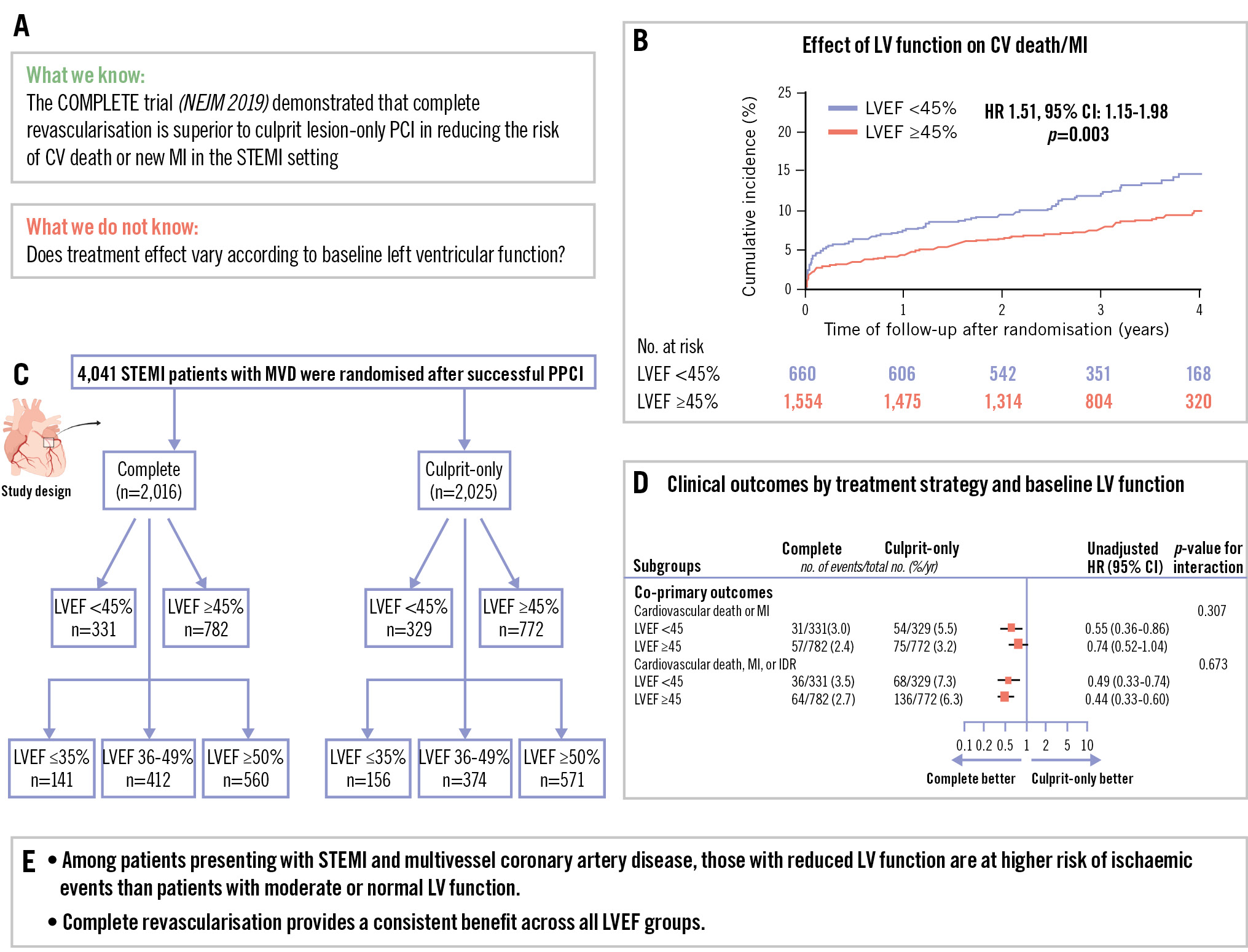 Central illustration. Complete versus culprit lesion-only PCI in STEMI: does LV function matter? A) Study rationale. B) Cumulative incidence of CV death/MI by LV function. C) Study design. D) Clinical outcomes according to treatment strategy and baseline LVEF. E) Summary of the trial’s main finding: there is a consistent benefit of complete revascularisation across LVEF categories. In patients presenting with STEMI and multivessel disease, complete revascularisation reduces major cardiovascular events, regardless of LVEF. CI: confidence interval; HR: hazard ratio; LV: left ventricular; LVEF: left ventricular ejection fraction; MI: myocardial infarction; PCI: percutaneous coronary intervention; PPCI: primary PCI; STEMI: ST-segment elevation myocardial infarction