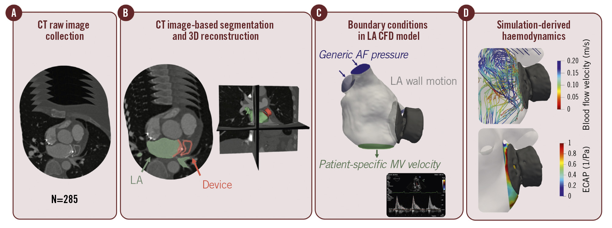 Figure 1. Workflow of computational fluid dynamics simulations. Overview of the patient-specific computational fluid dynamics (CFD) pipeline to stratify the risk of device-related thrombus (DRT). A) Description of the computed tomography (CT) post-left atrial appendage closure cohort, including pacifier- and plug-type device configurations. B) Binary mask segmentations for both the device and left atrium (LA) for each of the included patients, followed by three-dimensional (3D) model reconstruction. C) Outline of the modelling strategy applied in personalised CFD simulations. D) Evaluation of DRT risk scores derived from in silico haemodynamic indices. AF: atrial fibrillation; ECAP: endothelial cell activation potential; MV: mitral valve