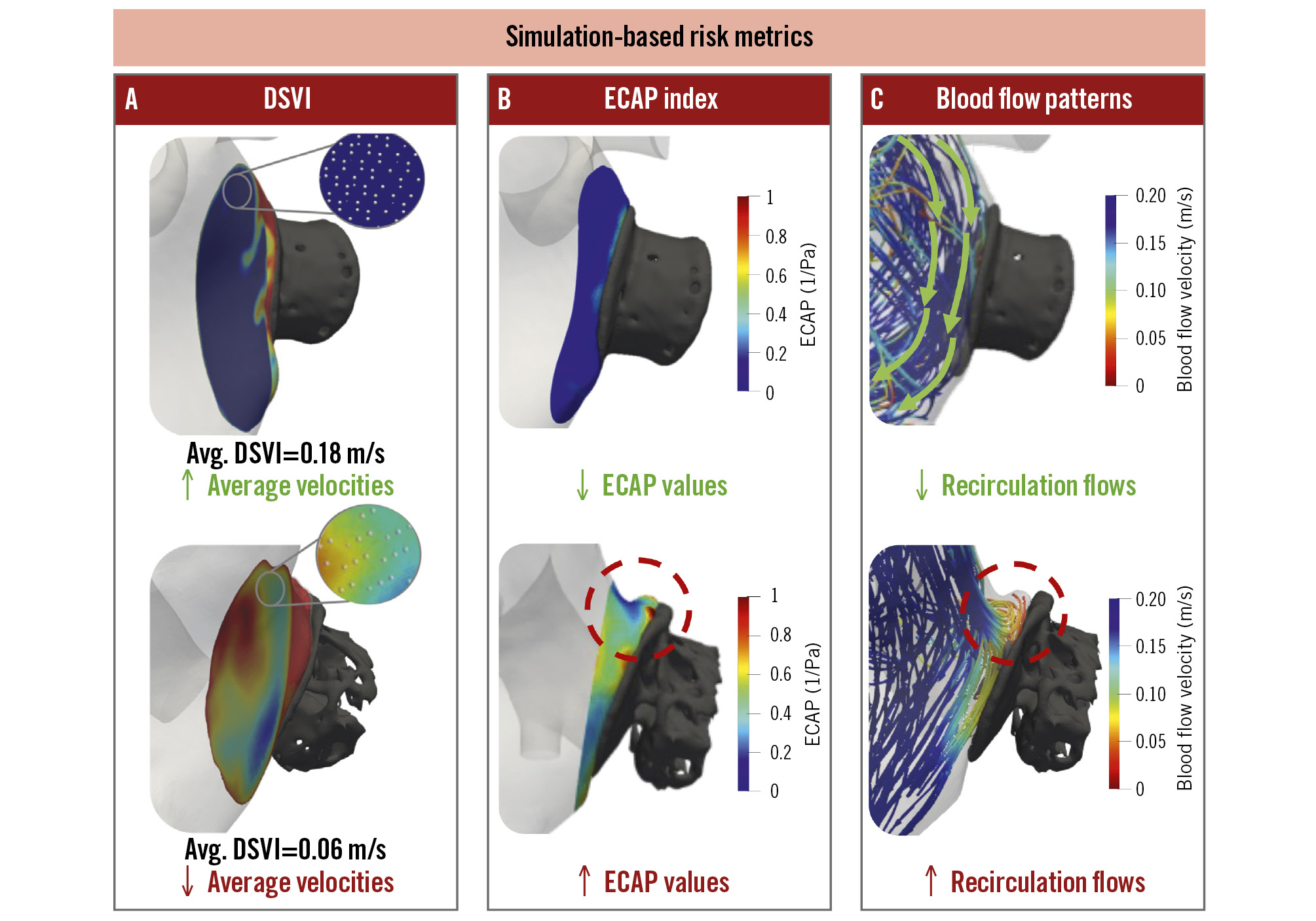 Figure 2. Computational fluid dynamics evaluation. Description of in silico haemodynamic metrics used to evaluate the impact of device configuration on blood flow dynamics and risk of stasis, including local average device surface velocity index (DSVI; A) at discrete points (white points), endothelial cell activation potential (ECAP; B), and presence of recirculation flows (C). Top: favourable conditions with a lower risk of device-related thrombus (average DSVI >0.1 m/s, low ECAP values), shown in blue, with laminar, organised flow. Bottom: unfavourable conditions leading to a higher risk of device-related thrombus (average DSVI <0.1 m/s, high ECAP values), defining disturbed flow and recirculations (red circle).