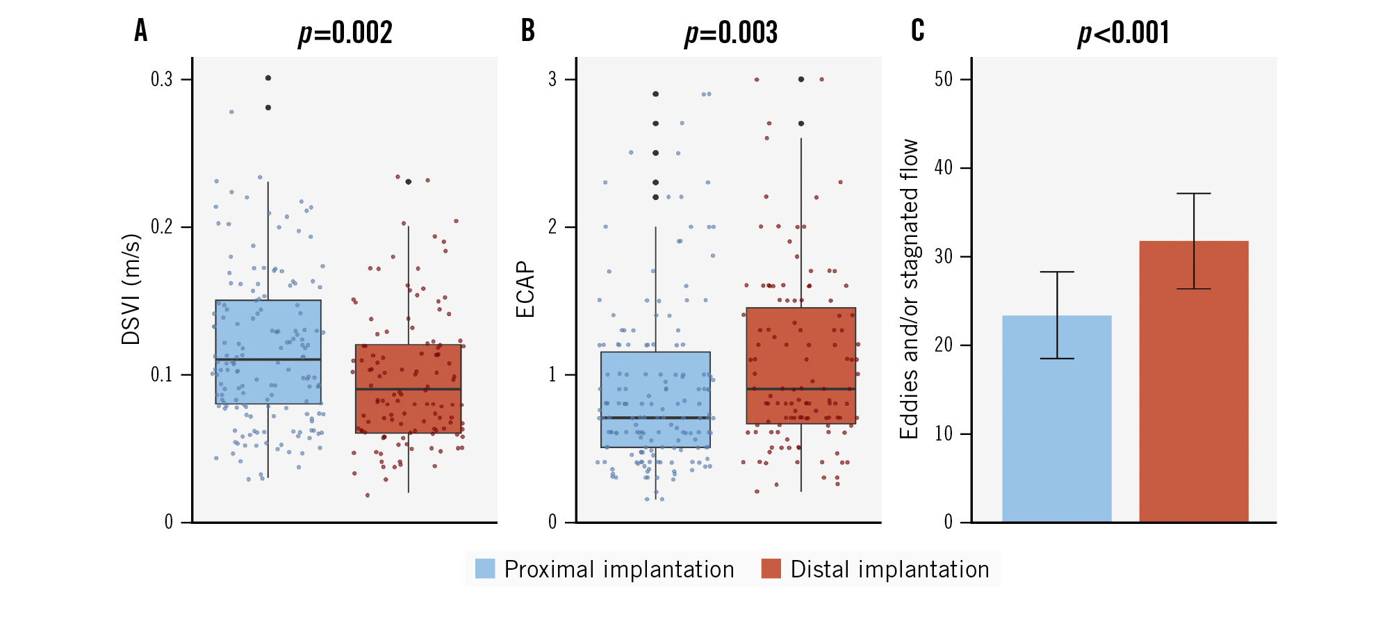 Significant differences in blood flow dynamics were observed between the proximal and distal device implantation groups (Table 2, Figure 3). The median blood flow velocity (i.e., DSVI) was higher in the proximal group compared with the distal group (0.11 m/s [IQR 0.08-0.15] vs 0.09 m/s [IQR 0.06-0.12]; p=0.002). Similarly, the ECAP was significantly lower in the proximal group (0.75 [IQR 0.50-1.20]) than in the distal group (0.90 [IQR 0.67-1.50]; p=0.003). Blood flow complexity, defined as the presence of eddies and/or stagnated flow zones, was substantially less frequent in the proximal group (40.5%) compared with the distal group (74.6%; p<0.001).