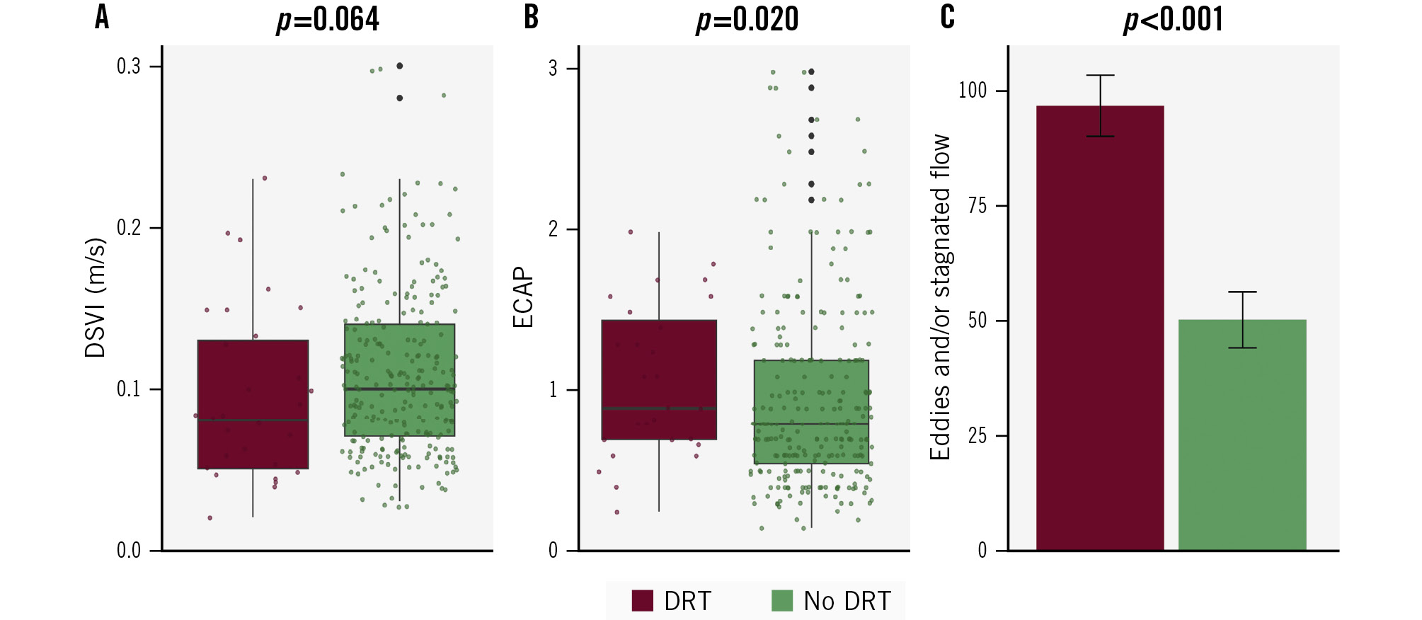 Figure 4. Simulation-based haemodynamic indices according to device-related thrombus occurrence. Comparison of flow characteristics between DRT (dark red) and no DRT (green). A) Velocity over the LAAC device. B) Endothelial cell activation potential (ECAP). C) Eddies and/or stagnated flow. DRT: device-related thrombus; DSVI: device surface velocity index; LAAC: left atrial appendage closure