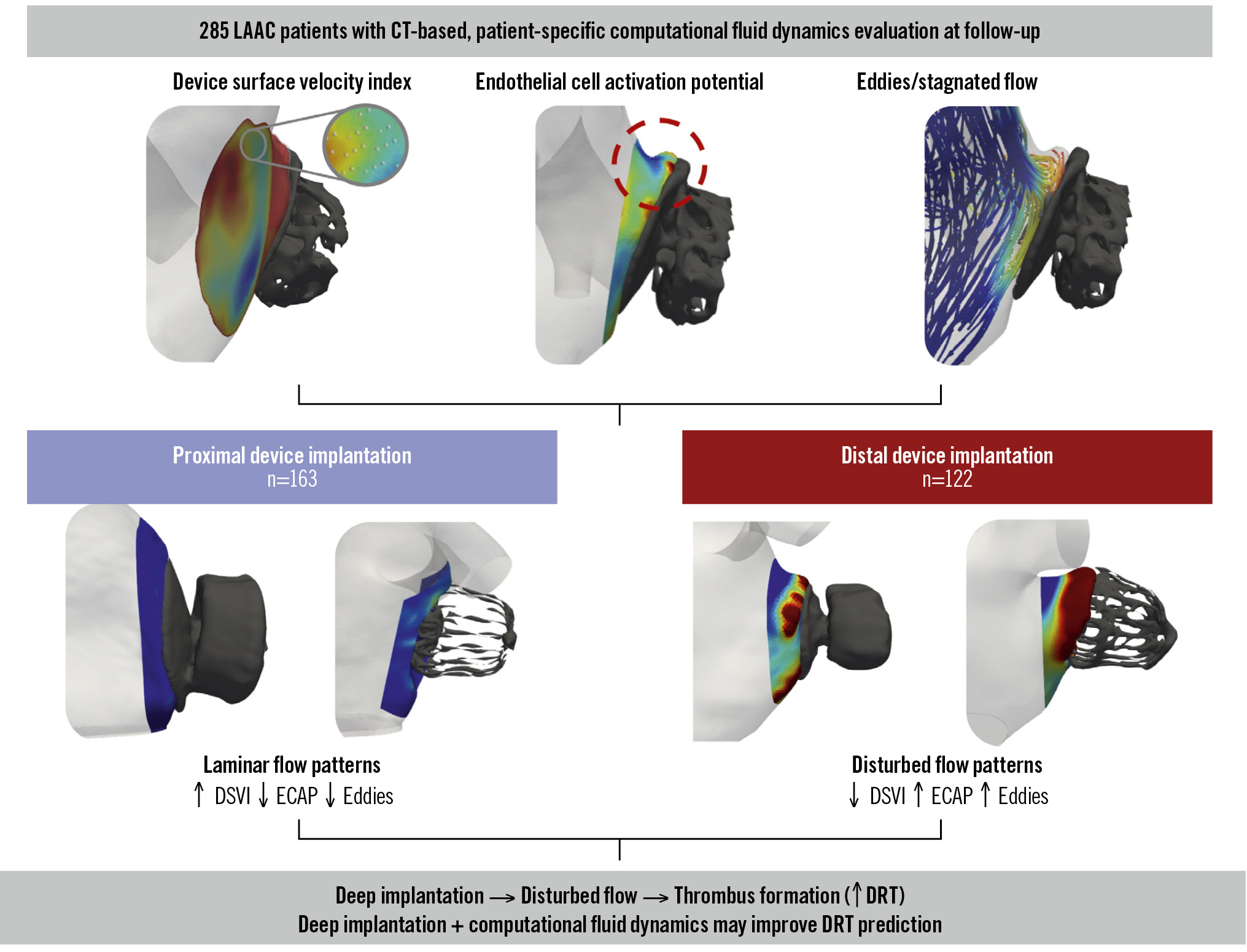 Central illustration. Impact of device implantation depth on blood flow dynamics after left atrial appendage closure: the IDEAL-LAAC study. Patient-specific computational fluid dynamics simulations based on follow-up cardiac computed tomography (CT) were used to assess the device surface velocity index (DSVI), endothelial cell activation potential (ECAP), and flow stagnation/eddies. Compared with proximal device implantation (n=163), distal implantation (n=122) was associated with disturbed flow patterns, including a lower DSVI, higher ECAP, and increased eddy formation. These adverse haemodynamic conditions were linked to a higher risk of device-related thrombus (DRT). LAAC: left atrial appendage closure