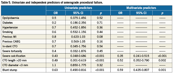 Among lesions treated by anterograde approach, blunt stump, CTO length > 20 mm and the presence of severe calcifications were recognised as univariate predictors of procedural failure (OR 0.63, 95% CI 0.490-0.816 , p<0.001, OR 0.49, 95% CI 0.301-0.619 p<0.001 and OR 0.43, 95% CI 0.348-0.686, p<0.001, respectively). After multivariate analysis the same variables resulted independent predictors of procedural antegrade failure (OR 0.59, 95% CI 0.435-0.807, p=0.001, OR 0.52, 95% CI 0.352-0.790, p=0.002 and OR 0.35, 95% CI 0,241-0.515, p<0.001, respectively).