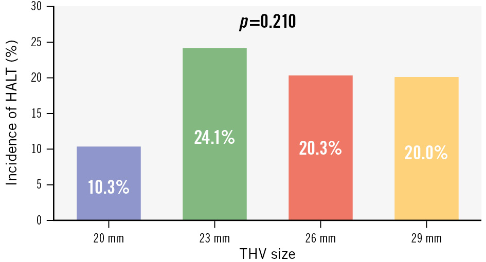 Figure 1. Incidence of HALT for each THV size. Bar graph showing the incidence of HALT for each size of the SAPIEN 3 Ultra RESILIA prosthesis. HALT: hypoattenuating leaflet thickening; THV: transcatheter heart valve