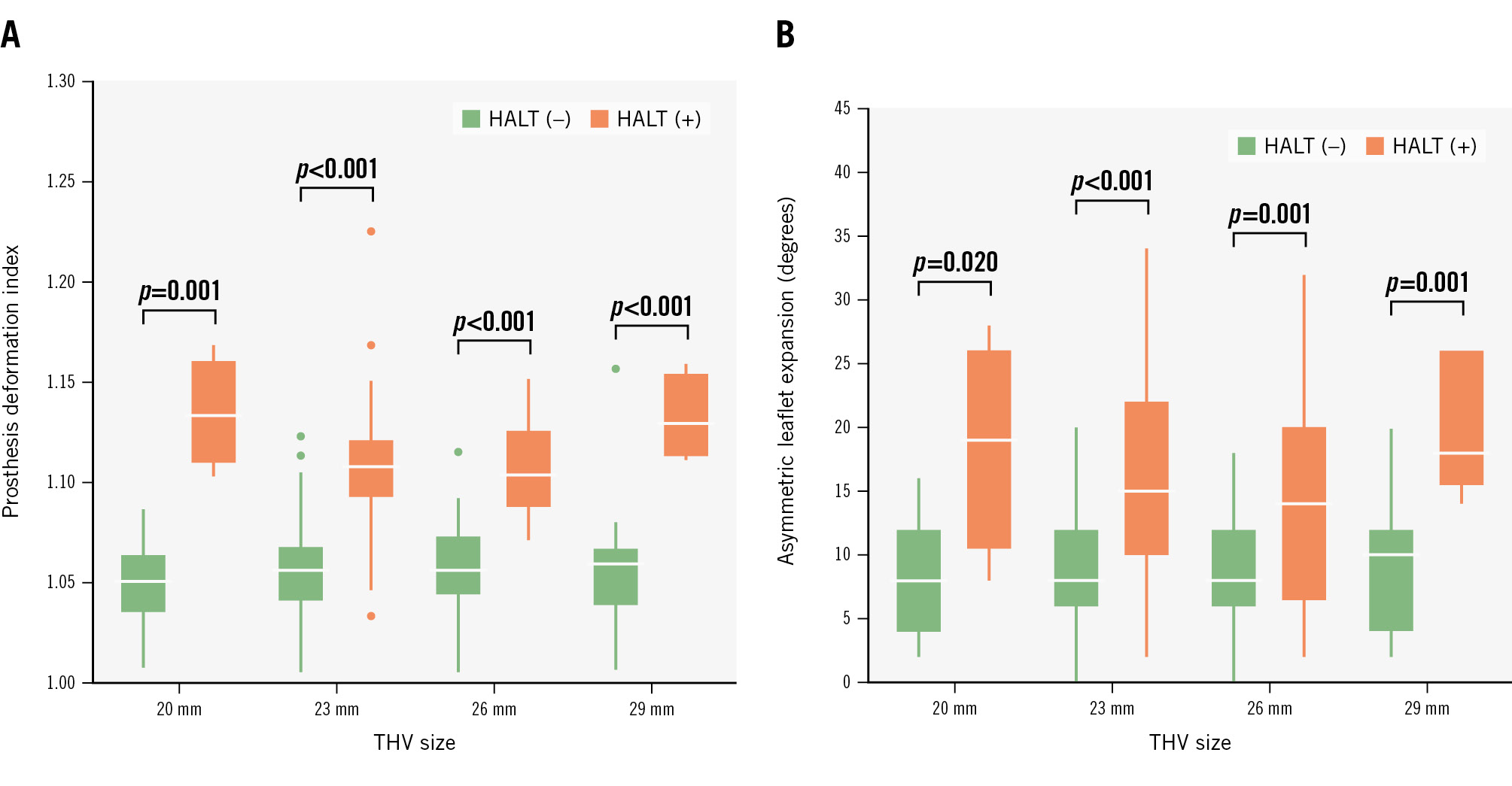 Compared with the nominal THV areas offered by the manufacturer, underexpansion of the implanted THV was observed at all levels of the S3UR frame in post-TAVI CT (Table 3). Regardless of the presence or absence of HALT, the expansion area percentage of the THV was the smallest at the prosthesis waist level with a median prosthesis deformation index of 1.06, indicating an hourglass-shaped implantation of the THV. However, patients with HALT had a larger prosthesis deformation index than those without HALT (1.11 [IQR 1.09-1.13] vs 1.06 [IQR 1.04-1.07]; p<0.001), and this difference was observed for all THV sizes (Figure 2A). THV eccentricity, ranging from 0.29 to 0.35 at each level of the THV, was comparable between the two groups at all levels, whereas asymmetric leaflet expansion was associated with HALT development (16° [IQR 9-22°] vs 8° [IQR 6-12°]; p=0.001). Larger asymmetric leaflet expansion in patients with HALT was also identified for all THV sizes (Figure 2B). The intra- and interobserver agreement was acceptable for the prosthesis deformation index (intraobserver ICC=0.94; interobserver ICC=0.91) and the asymmetric leaflet expansion (intraobserver ICC=0.95; interobserver ICC=0.91).