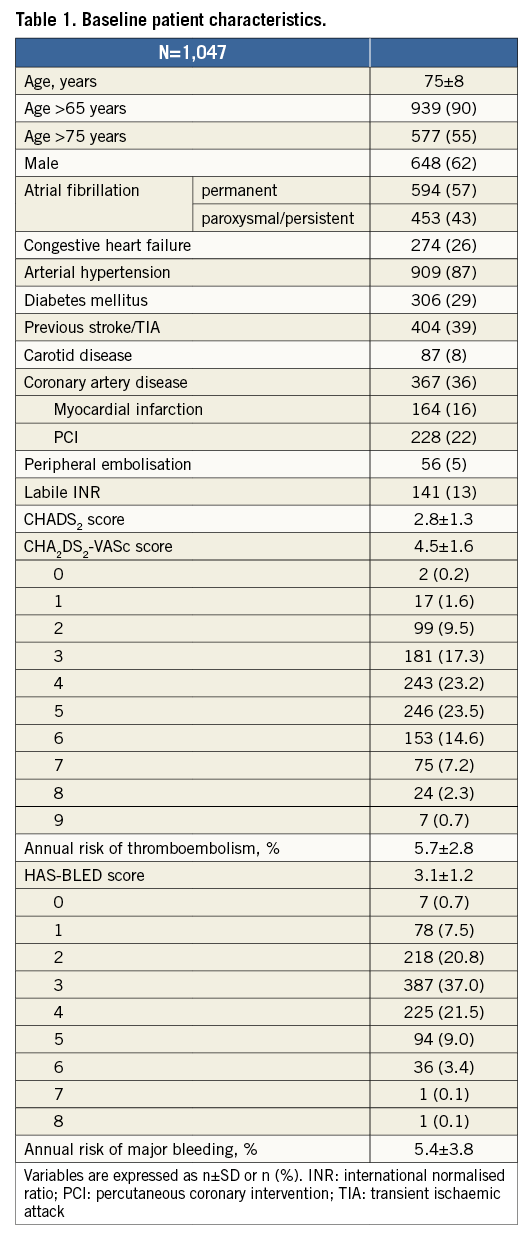 Methods and results: Data from consecutive patients treated in 22 centres were collected. A total of 1,047 patients were included in the study. Procedural success was 97.3%. There were 52 (4.97%) periprocedural major adverse events. Follow-up was complete in 1,001/1,019 (98.2%) of successfully implanted patients (average 13 months, total 1,349 patient-years). One-year all-cause mortality was 4.2%. No death at follow-up was reported as device-related. There were nine strokes (0.9%) and nine transient ischaemic attacks (0.9%) during follow-up. The annual rate of systemic thromboembolism was 2.3% (31/1,349 patient-years), which is a 59% risk reduction. There were 15 major bleedings (1.5%) during follow-up. The annual rate of major bleeding was 2.1% (28/1,349 patient-years), which is a 61% risk reduction. Patients with single LAAO on aspirin monotherapy or no therapy and longer follow-up had fewer cerebral and fewer bleeding events.