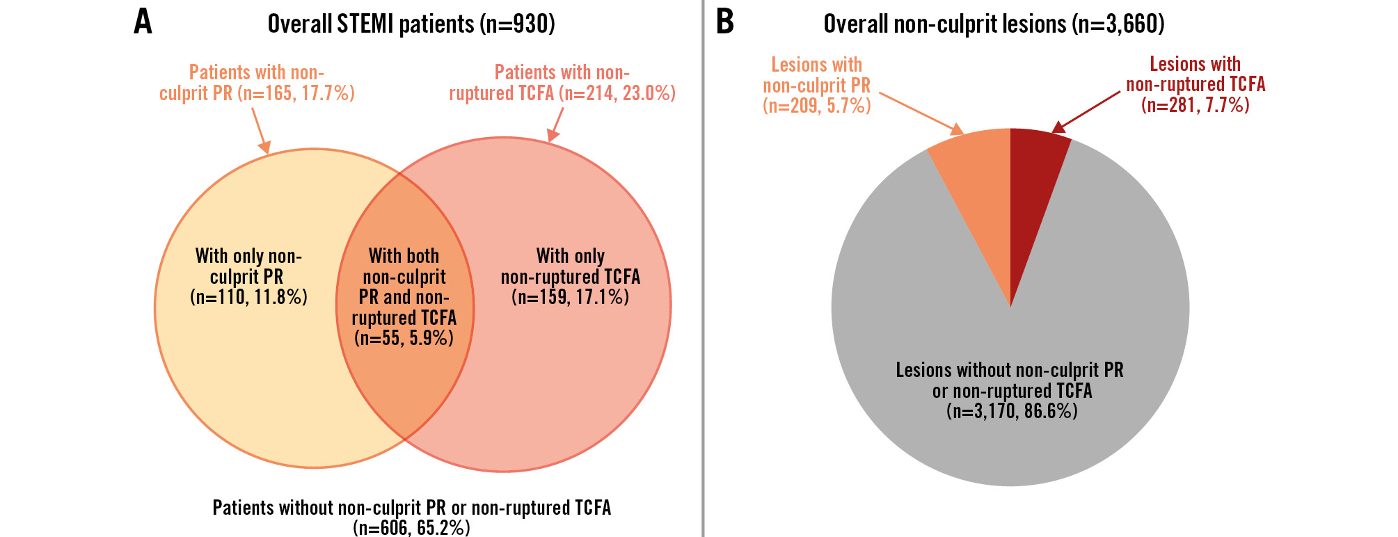 Figure 2. The frequency of non-culprit plaque rupture and non-ruptured TCFA. A) Patient-level analysis (n=930). There were 165 STEMI patients (17.7%) with non-culprit PR and 214 (23.0%) with non-ruptured TCFA. These included 110 patients (11.8%) with only non-culprit PR, 55 (5.9%) with both non-culprit PR and non-ruptured TCFA, and 159 (17.1%) with only non-ruptured TCFA. B) Plaque-level analysis (n=3,660). Within the 3,660 non-culprit plaques, 209 (5.7%) had the PR phenotype, and 281 (7.7%) had the non-ruptured TCFA phenotype. PR: plaque rupture; STEMI: ST-segment elevation myocardial infarction; TCFA: thin-cap fibroatheroma