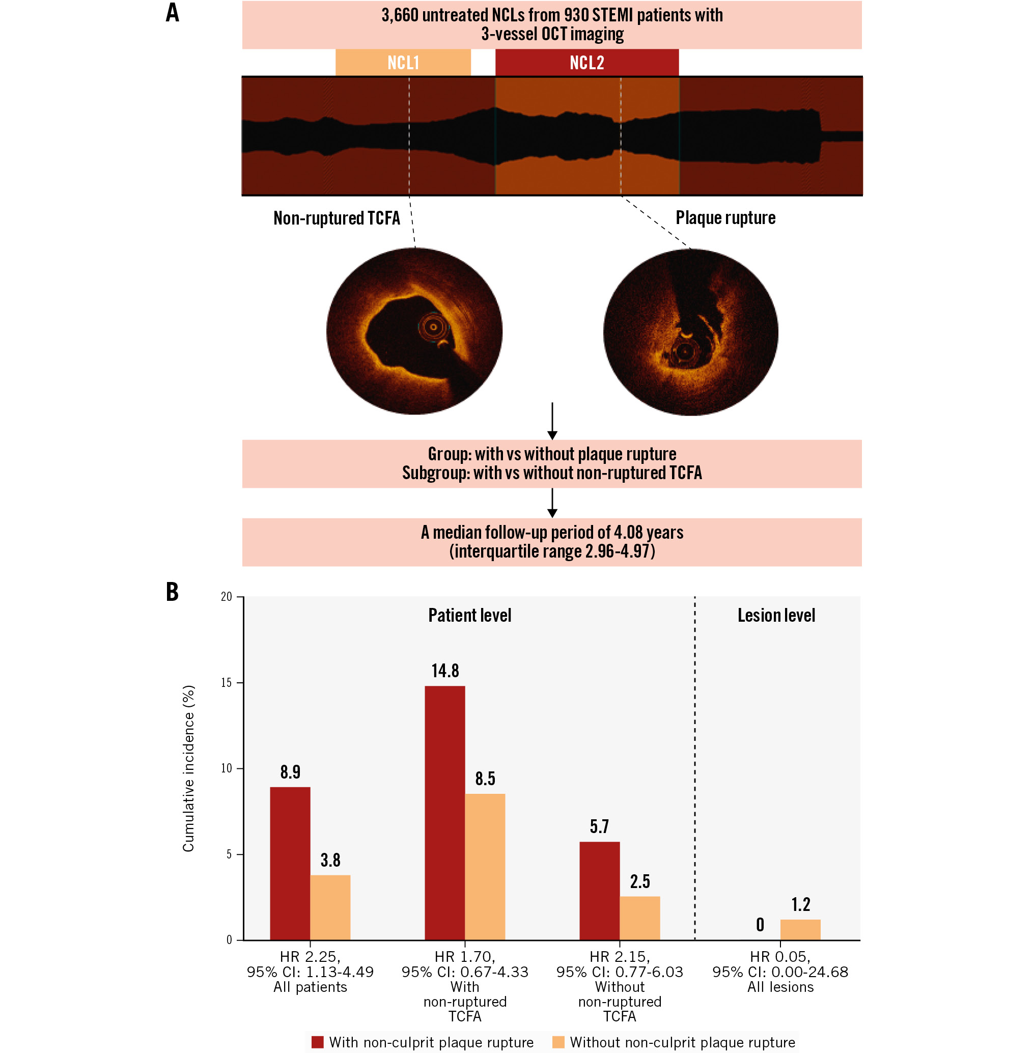 Central illustration. The long-term prognosis value of OCT imaging in STEMI patients with non-culprit plaque rupture. A) OCT examinations were conducted on a total of 3,660 untreated NCLs from 930 STEMI patients, with a median follow-up period of 4.08 years (interquartile range 2.96-4.97). Patients and lesions were categorised into groups with and without non-culprit plaque rupture. Furthermore, non-ruptured TCFA was a classification standard in the subgroup. B) STEMI patients in the non-culprit plaque rupture group had worse long-term outcomes (8.9% vs 3.8%, unadjusted HR 2.25, 95% CI: 1.13-4.49). Furthermore, after stratification by the presence or absence of non-ruptured TCFA, non-culprit plaque rupture was not associated with NCL-related MACE. In addition, NCL-related MACE were similar for lesions with versus without plaque rupture (0.0% vs 1.2%, unadjusted HR 0.05, 95% CI: 0.00-24.68). CI: confidence interval; HR: hazard ratio; MACE: major adverse cardiac events; NCL: non-culprit lesion; OCT: optical coherence tomography; STEMI: ST-segment elevation myocardial infarction; TCFA: thin-cap fibroatheroma