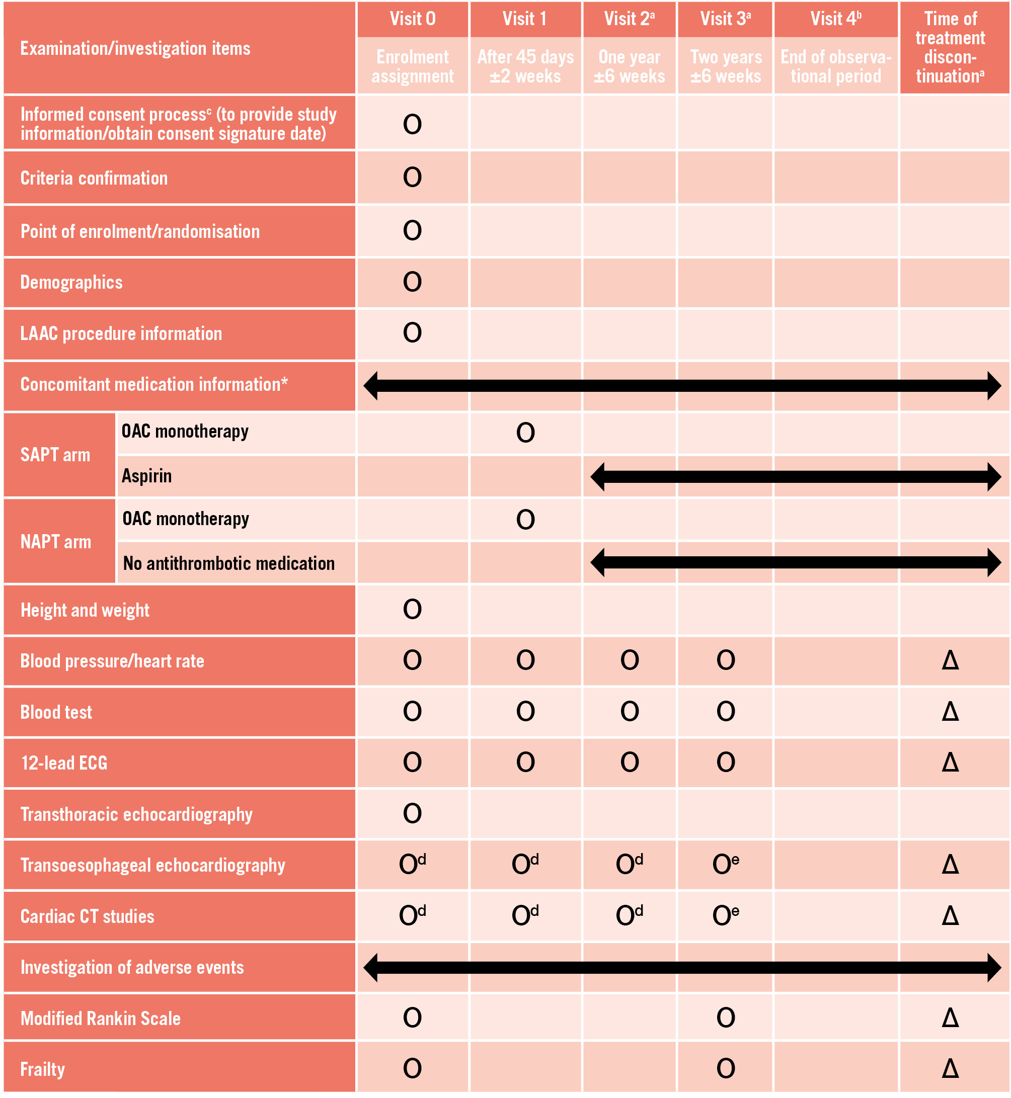 Figure 2. Study schedule. Ο Indicates scheduled assessments. ∆ Indicates assessments performed as clinically indicated. aTelephone interviews may be used to collect information on clinical status, concomitant medications, and adverse events when a participant is unable to return for follow-up due to relocation or transfer to another hospital. bThe observational period extends up to 4 years after enrolment of the first patient and applies to participants followed for more than 2 years and 6 weeks after visit 3. Telephone interviews are the standard method of follow-up; however, routine office visits may also be used for observational data collection. cProviding study information prior to the LAAC procedure is permitted; however, written informed consent must be obtained on the day following the procedure. dTOE and/or cardiac CT will be performed according to the study schedule. eTOE or cardiac CT will be performed at the physician’s discretion; however, in cases of suspected embolic events, assessment must be performed using TOE or cardiac CT. *In addition to the clinical interview, antithrombotic medication adherence will be assessed by reviewing the patient’s medication diary at each office visit. CT: computed tomography; ECG: electrocardiography; LAAC: left atrial appendage closure; OAC: oral anticoagulant; TOE: transoesophageal echocardiography