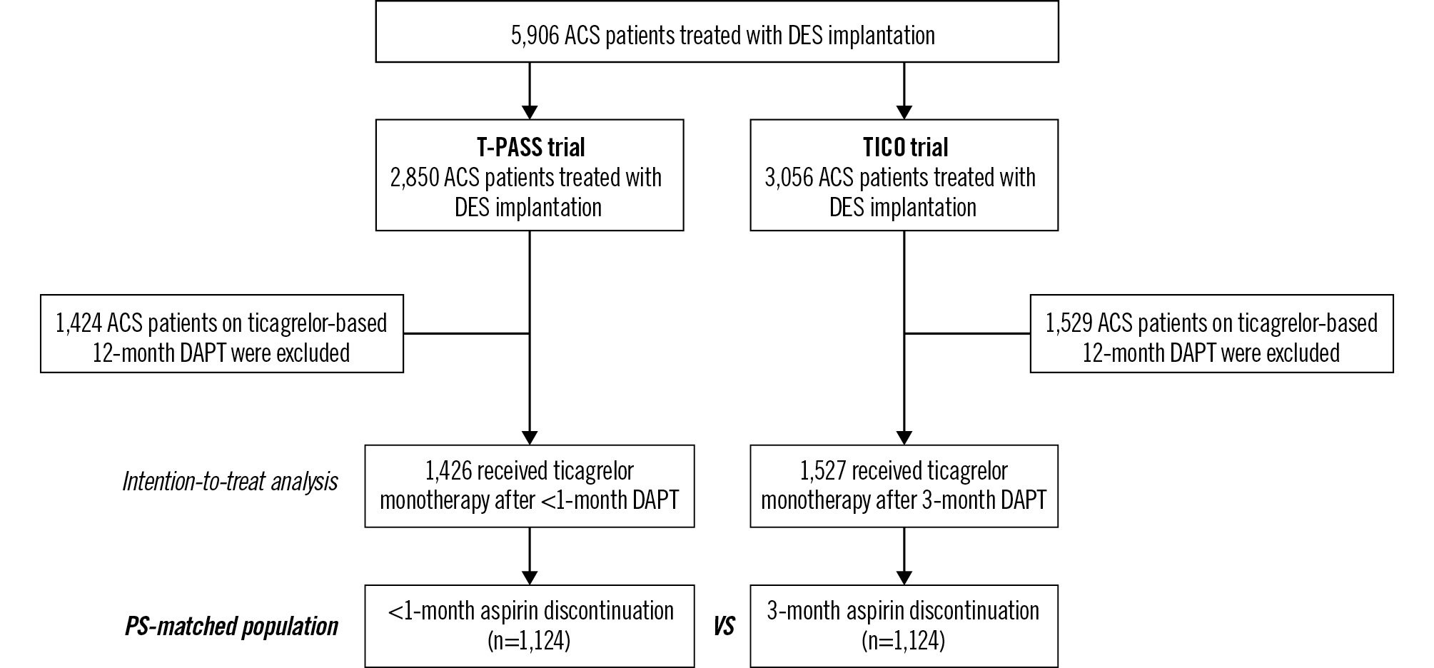 Figure 1. The selection process of the study population. ACS: acute coronary syndrome; DAPT: dual antiplatelet therapy; DES: drug-eluting stent; PS: propensity score; T-PASS: Ticagrelor Monotherapy in PAtients Treated With New-generation Drug-eluting Stents for Acute Coronary Syndrome; TICO: Ticagrelor Monotherapy After 3 Months in the Patients Treated With New Generation Sirolimus Stent for Acute Coronary Syndrome