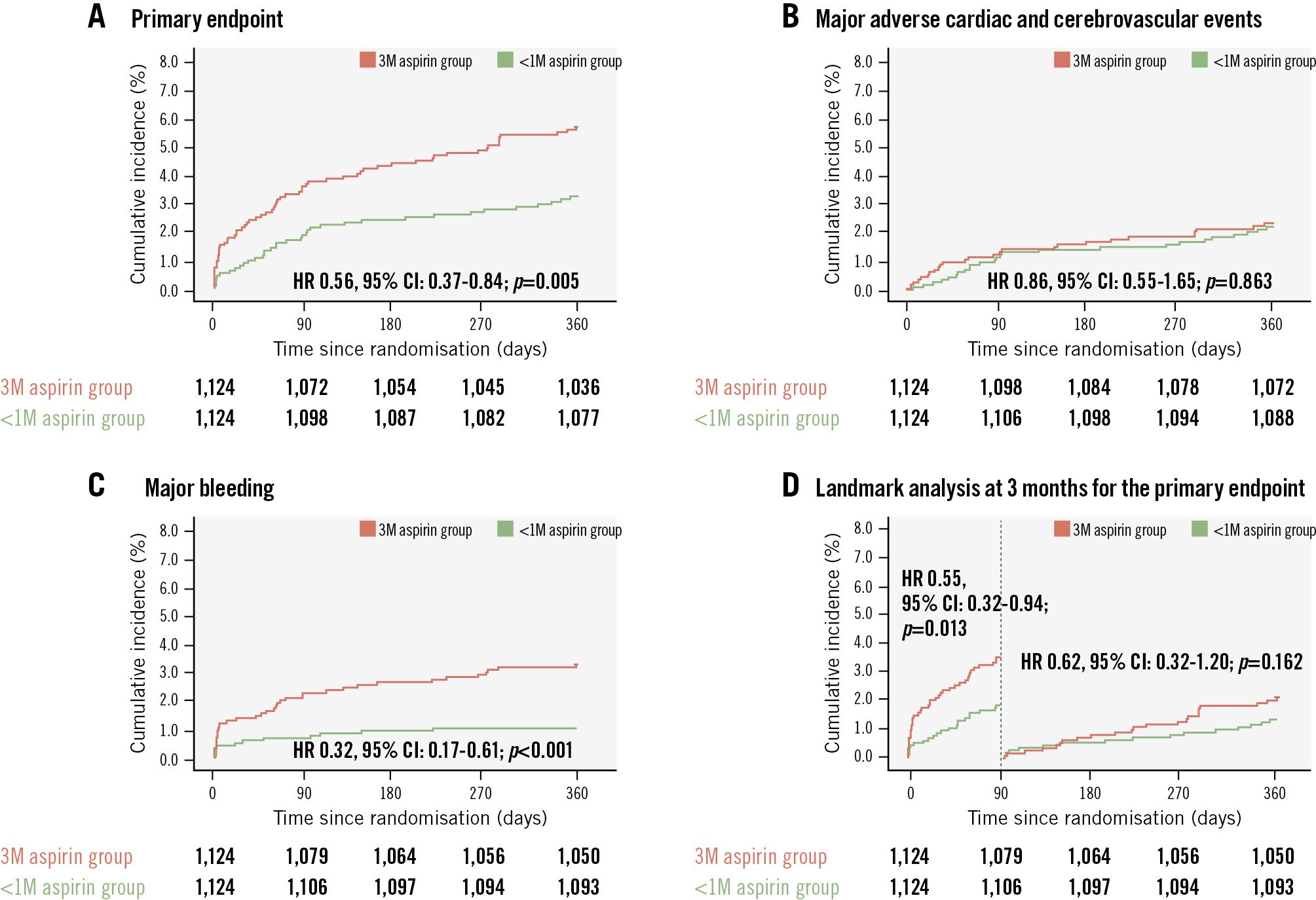 Results: The primary endpoint occurred less frequently in the <1-month group than in the 3-month group (3.2% vs 5.6%; hazard ratio [HR] 0.56, 95% confidence interval [CI]: 0.37-0.84; p=0.005). Ischaemic event rates were comparable (2.2% vs 2.3%; HR 0.86, 95% CI: 0.55-1.65; p=0.863), whereas major bleeding was significantly lower in the <1-month group (1.1% vs 3.3%; HR 0.32, 95% CI: 0.17-0.61; p<0.001). Landmark analysis showed that event rates diverged primarily within the first 90 days, with no significant heterogeneity between the early and late periods.