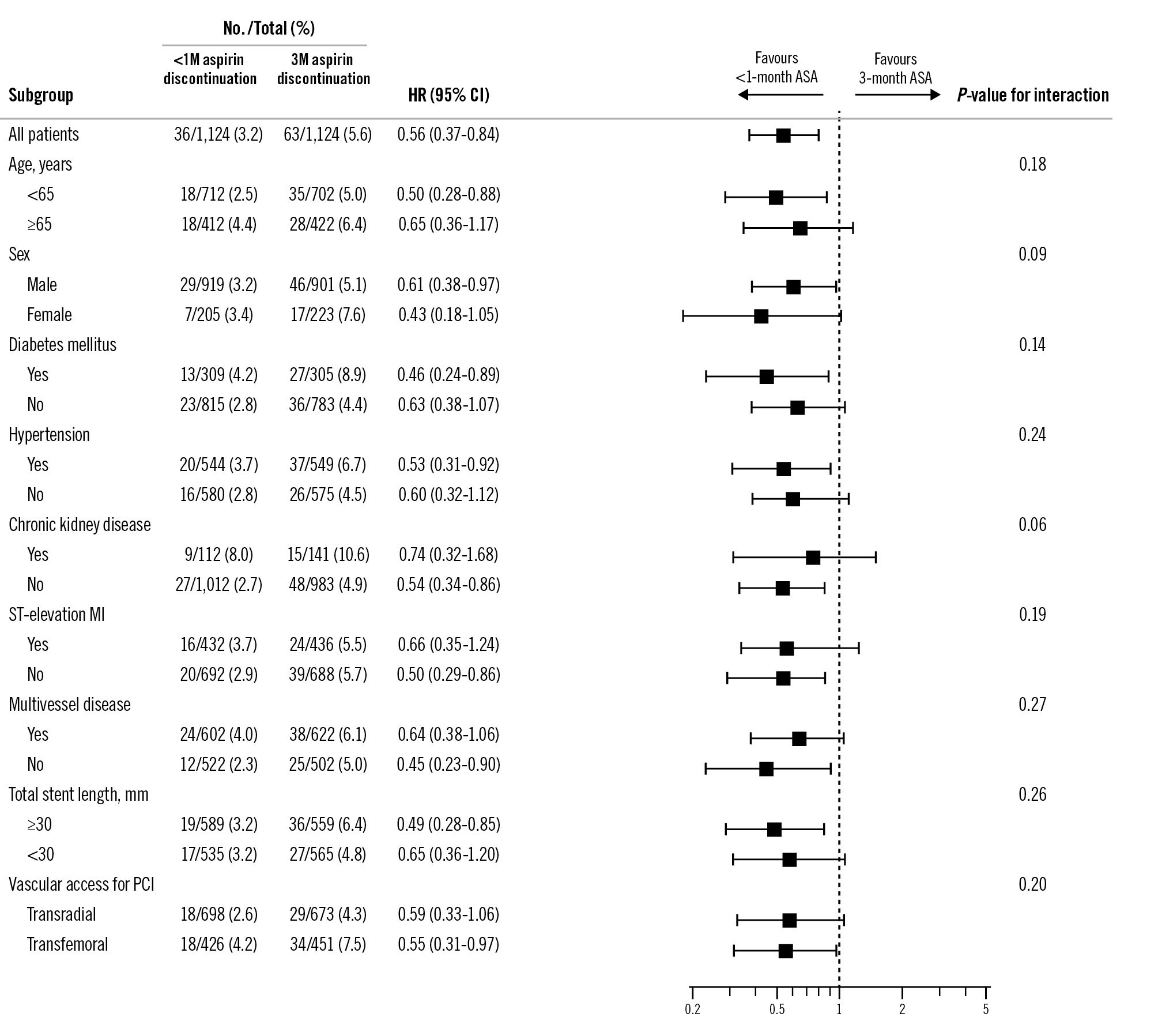 Figure 3 shows the subgroup analyses of the primary endpoint. The effect of aspirin discontinuation within 1 month versus at 3 months appeared consistent across clinically relevant subgroups. However, the number of events within each subgroup was limited, and these analyses should be considered exploratory.