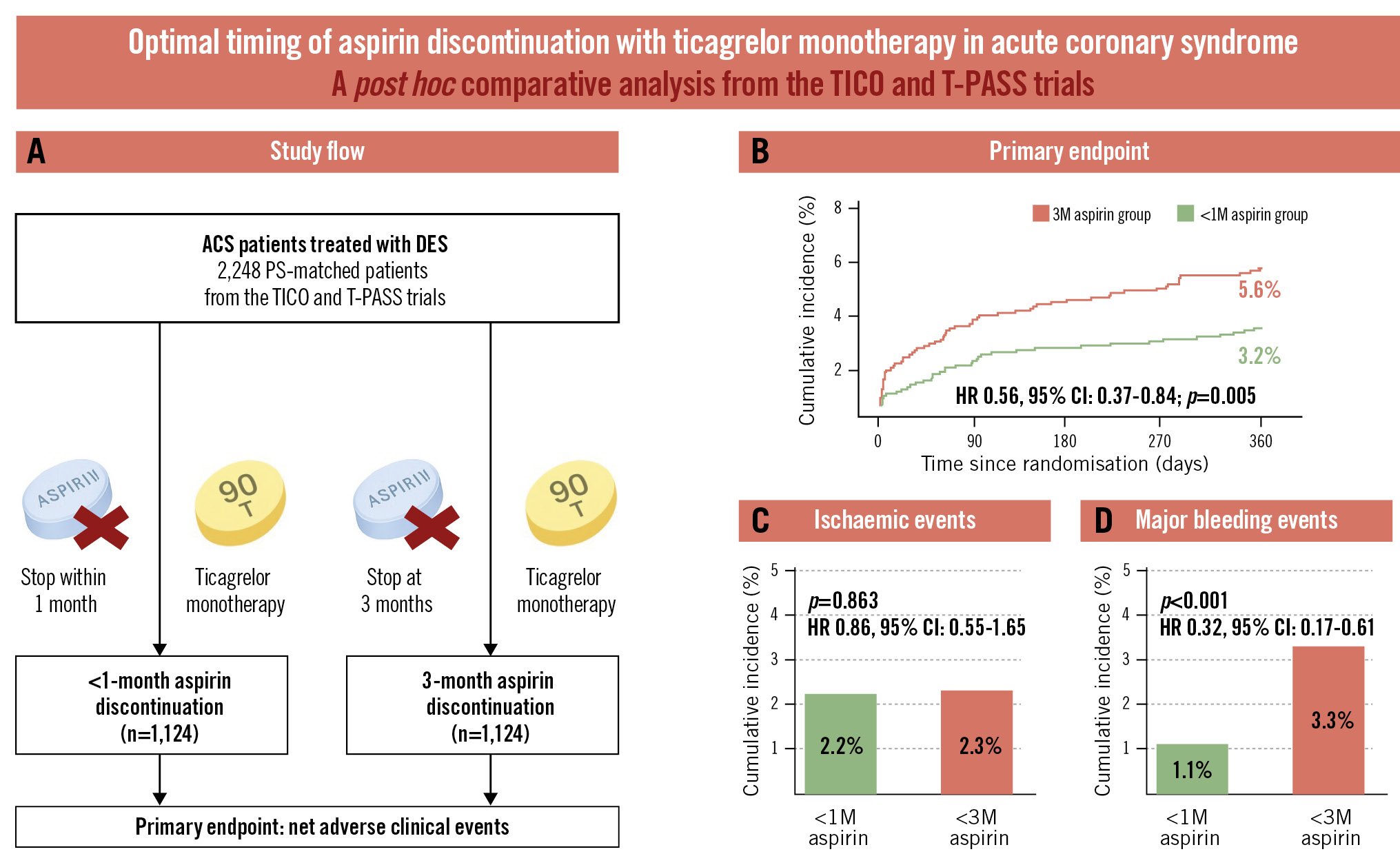 Central illustration. Aspirin discontinuation within 1 month versus at 3 months with ticagrelor monotherapy in acute coronary syndrome. A) Study flow. Cumulative incidences of the primary endpoint (B), ischaemic events (C), and major bleeding events (D). 1M: 1 month; 3M: 3 months; ACS: acute coronary syndrome; CI: confidence interval; DES: drug-eluting stent; HR: hazard ratio; PS: propensity score; T-PASS: Ticagrelor Monotherapy in PAtients Treated With New-generation Drug-eluting Stents for Acute Coronary Syndrome; TICO: Ticagrelor Monotherapy After 3 Months in the Patients Treated With New Generation Sirolimus Stent for Acute Coronary Syndrome