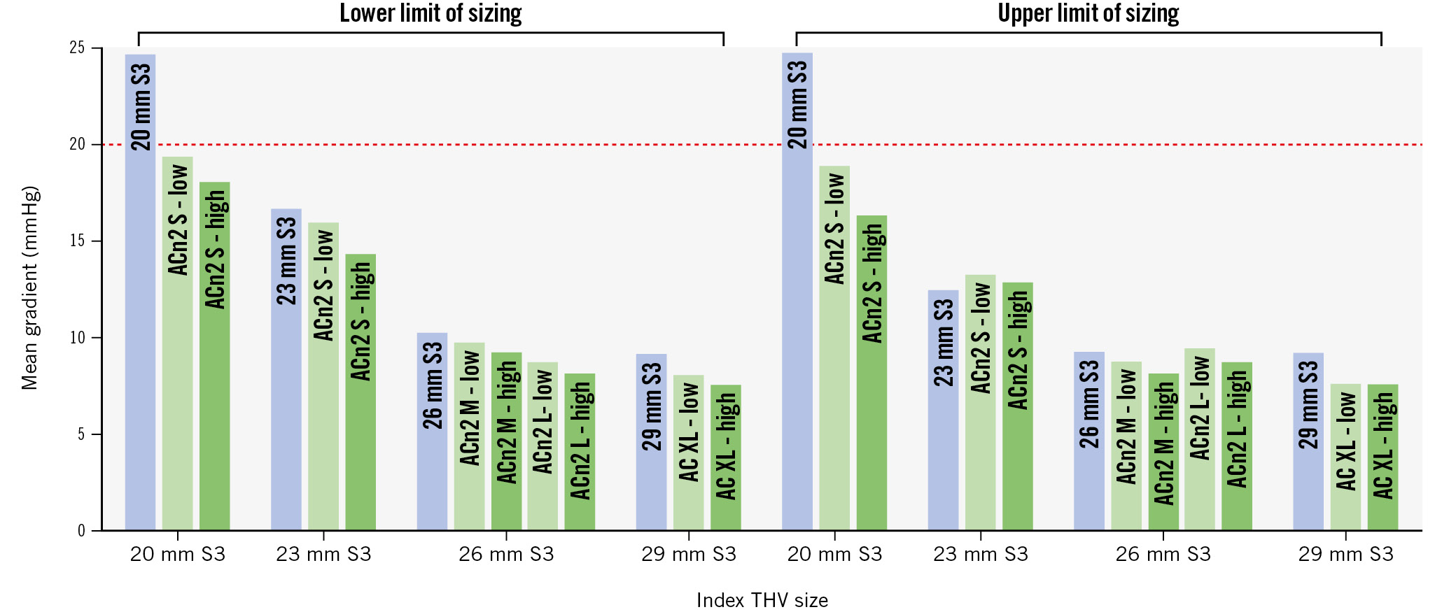 The hydrodynamic function of each of the combinations is detailed in Table 1 and Figure 3. Overall, most of the samples resulted in acceptable performance according to ISO standards. However, in the 20 mm S3, the use of a 20 mm S3 as a redo THV resulted in a mean gradient (MG) >20 mmHg, while the use of an ACn2 resulted in an MG <20 mmHg. The difference between the ACn2 and the S3 was less marked for the larger S3 THV sizes (Central illustration). The hydrodynamic function was only marginally affected by the size of the native annulus within a determined THV size without major differences between the S3 in S3 and ACn2 in S3 configurations. The largest difference was noted for redo-TAVI within the 23 mm S3. In this configuration, for the S3 in S3, the MG was 16.6 mmHg in the small annulus but 12.4 mmHg in the large annulus. For the small ACn2, the MG was 14.3 mmHg in the small annulus and 12.8 mmHg in the large annulus. Of note, the extent of the effect of the implantation depth of the ACn2 (nominally high vs nominally low) on hydrodynamic function was limited. Indeed, the MG was 1-2 mmHg lower at the high position for the small ACn2, and this difference was <1 mmHg for the medium and XL sizes. Finally, the use of a large ACn2 offered little advantage compared to the medium ACn2 when implanted in a 26 mm S3.