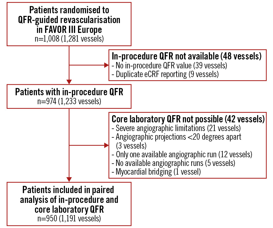 Figure 1. Patient flowchart. A total of 1,008 patients (1,281 vessels) were randomised to a QFR-guided strategy in the FAVOR III Europe trial. Of these, 974 patients (1,233 vessels) had available in-procedure QFR values. Core laboratory QFR was not feasible in 24 patients (42 vessels). A total of 950 patients (1,191 study vessels) were included in the paired analysis. eCRF: electronic case report form; QFR: quantitative flow ratio