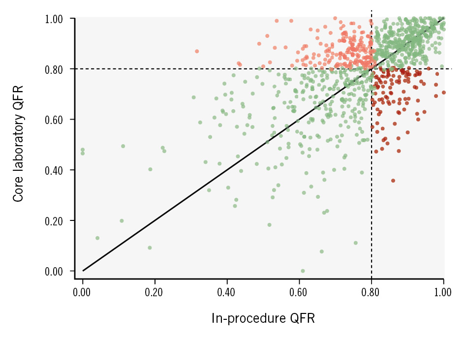 Figure 2. Association between in-procedure QFR and core laboratory QFR. The scatter plot illustrates the association between in-procedure and core laboratory QFR analyses. This patient-level analysis includes the observation with the largest numerical difference per patient in cases with more than one paired QFR assessment. Darker areas indicate higher point density. All vessels showing diagnostic agreement between in-procedure and core laboratory QFR are marked in green, while all vessels showing disagreement are marked in red: pale red: in-procedure QFR ≤0.80 and core laboratory QFR >0.80; dark red: in-procedure QFR >0.80 and core laboratory QFR ≤0.80. QFR: quantitative flow ratio