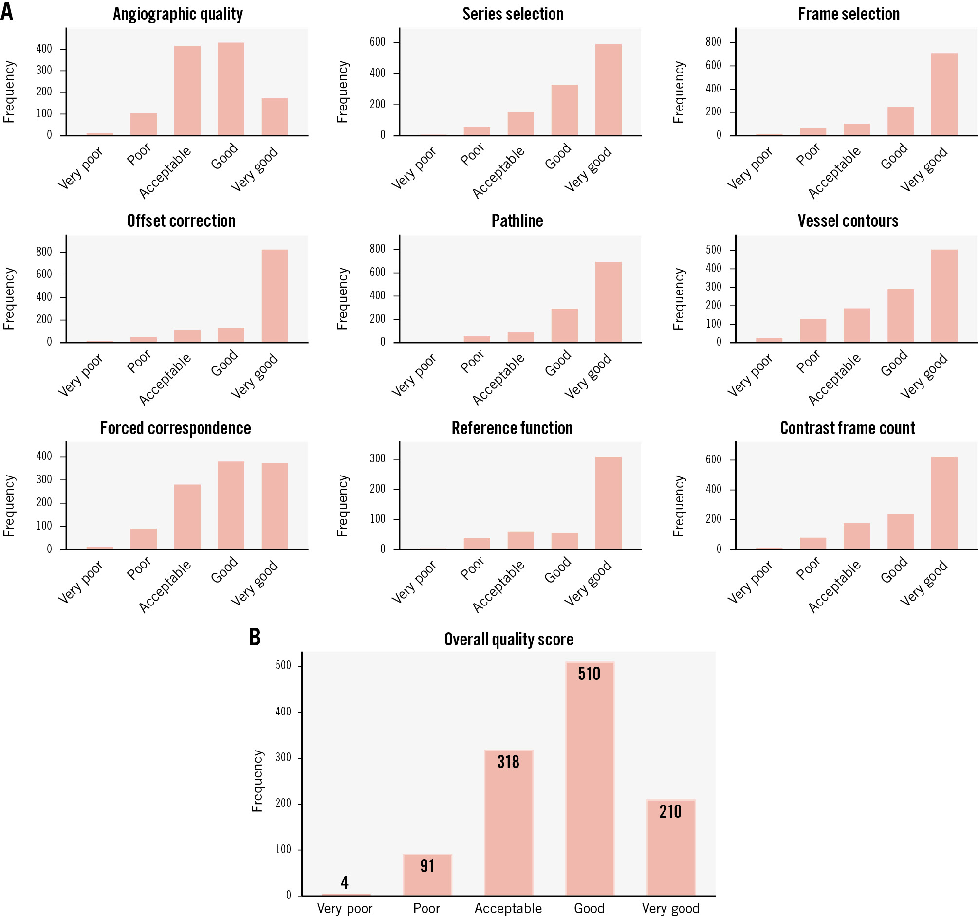 Figure 3. Overall quality score of in-procedure QFR. Lesion-level analysis. The bar graphs display the distribution of quality scores for each step of the QFR analysis (A) and the overall quality score (B) as assigned by the core laboratory during the continuous feedback of QFR analyses in FAVOR III Europe. The quality scores were based on adherence to the standard operating procedure. Quality scores are presented as lesion-level frequencies. A total of 1,133 study lesions (89.1%) had QFR analysis source data available; these were evaluated by the core laboratory during the enrolment period of the FAVOR III Europe trial. Quality metrics were scored as follows: 1 (very poor); 2 (poor); 3 (acceptable); 4 (good); 5 (very good). QFR: quantitative flow ratio