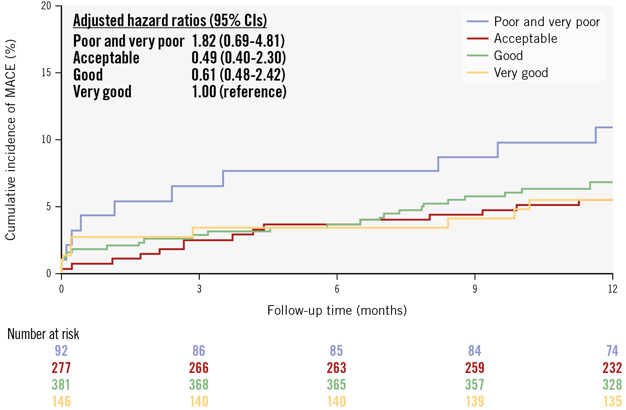 Figure 4. Cumulative incidence of MACE stratified by in-procedure QFR analysis quality. A total of 1,133 study lesions in 896 patients (88.9%) had QFR source data available, allowing for core laboratory evaluation during the enrolment period of the FAVOR III Europe trial. An overall quality score was assigned to each QFR analysis on a scale from 1 (very poor) to 5 (very good). For each patient, the lowest QFR analysis quality score was used in the analysis. The rate of 1-year MACE – including all-cause death, myocardial infarction, and unplanned revascularisation – was stratified by in-procedure QFR analysis quality. Due to the low number of patients in the two lowest quality categories, these were combined into a single group, which was assigned as the reference group. The hazard ratio was adjusted for angiographic image quality, SYNTAX score, and diabetes. The adjusted hazard ratios are reported together with a 95% confidence interval (CI). MACE: major adverse cardiac events; QFR: quantitative flow ratio