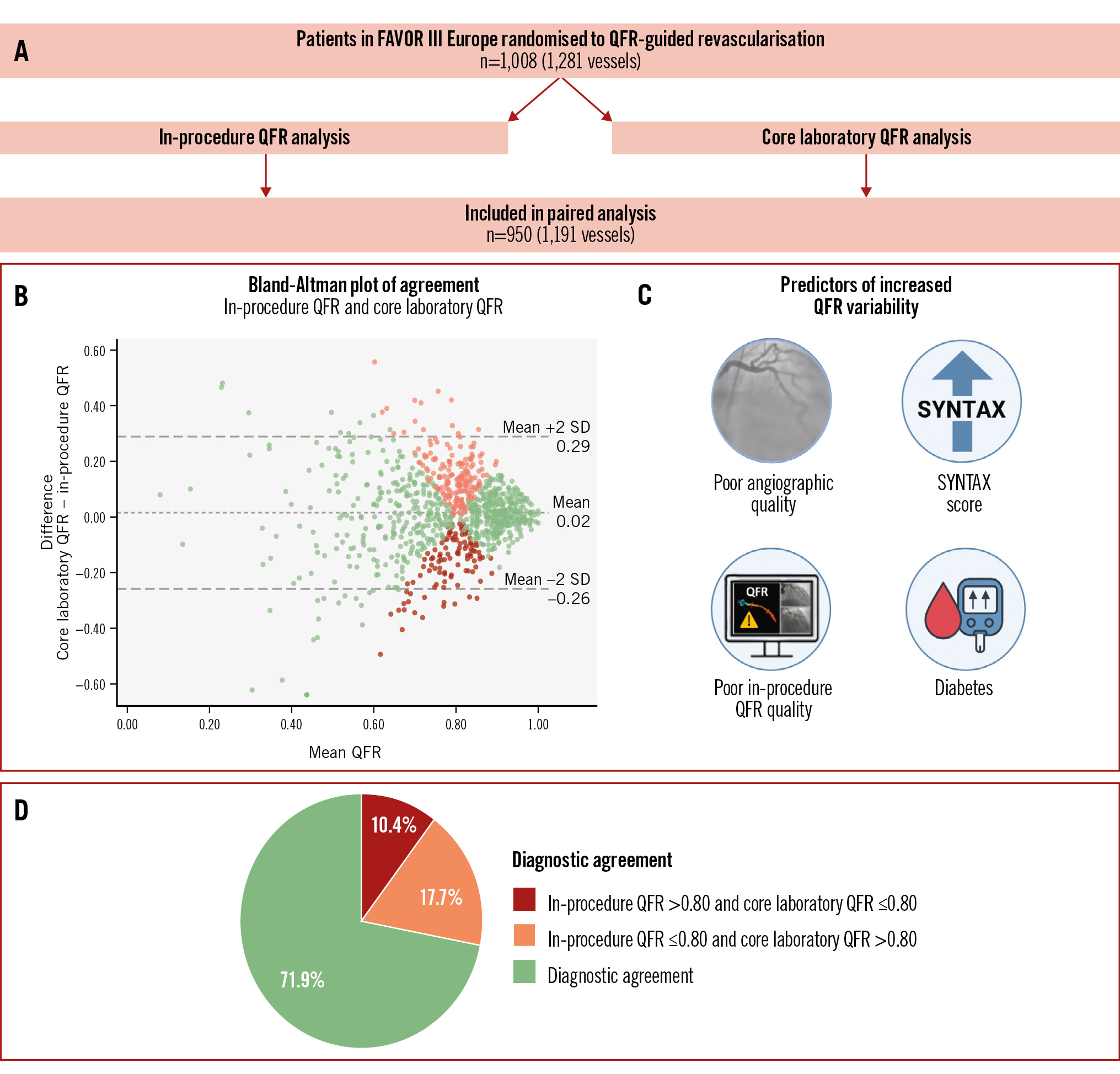 Central illustration. A FAVOR III Europe substudy: the REPEAT-QFR study. A) Patients in the QFR group of the FAVOR III Europe trial were included, and the study vessels were analysed in the core laboratory. A total of 950 patients (1,191 vessels) were included in the paired analyses. The following results are illustrated: (B) Bland-Altman plot with a bias of 0.02 between in-procedure and core laboratory QFR and 95% limits of agreement from –0.26 to 0.29. Vessels showing diagnostic agreement between in-procedure and core laboratory QFR are marked in green, while vessels showing disagreement are marked in red: pale red: in-procedure QFR ≤0.80 and core laboratory QFR >0.80; dark red: in-procedure QFR >0.80 and core laboratory QFR ≤0.80. Darker areas indicate higher point density. C) Significant predictors of increased QFR variability were the presence of diabetes, poor angiographic quality, poor in-procedure QFR analysis quality, and a higher SYNTAX score. D) The diagnostic agreement between in-procedure and core laboratory QFR was 71.9%. Lesions which were functionally significant in the procedure but not in the core laboratory amounted to 17.7% of all lesions, while 10.4% of lesions were significant in the core laboratory but not in the procedure. The Central illustration was created with Biorender.com. QFR: quantitative flow ratio; SD: standard deviation