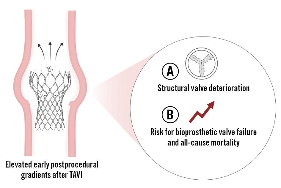 In this issue of EuroIntervention, Palmerini and colleagues present an important study exploring the association between early residual mean postprocedural gradients (ERMPGs) and long-term SVD rates, as well as the prognostic implications of SVD for BVF and mortality at 10 years, in a multicentre registry of 1,291 patients treated with a self-expanding, supra-annular CoreValve/Evolut prosthesis (Medtronic)3. The cumulative incidence of SVD was 3.6% (n=46) during extended follow-up, with a median time to SVD of 5.7±3.0 years. Notably, ERMPG emerged as an independent predictor of SVD, with a stepwise increase in SVD risk across the tertiles of ERMPG. An ERMPG threshold of 9 mmHg best predicted the 5-year risk of SVD. More than half of the patients with SVD (54%) developed BVF, and SVD was strongly associated with higher all-cause (adjusted hazard ratio [HR] 2.12; p<0.001) and cardiovascular mortality (adjusted HR 5.78; p<0.001) (Figure 1).