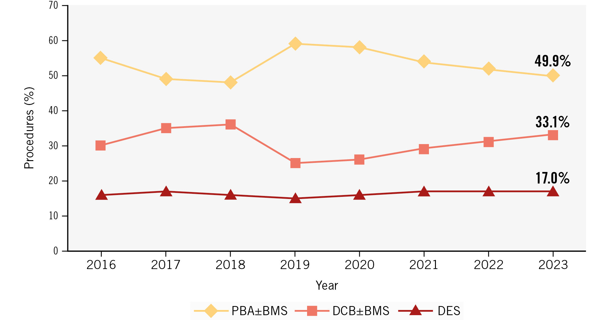 From 2016 to 2023, the relative use of DES increased (+0.17%, 95% CI: 0.07-0.27%; p=0.001), while the use of DCB±BMS decreased slightly (–0.19%, 95% CI: –0.71 to 0.33%; p=0.46), and that of PBA±BMS remained stable (+0.02%, 95% CI: –0.53 to 0.57%; p=0.95) (Figure 1).