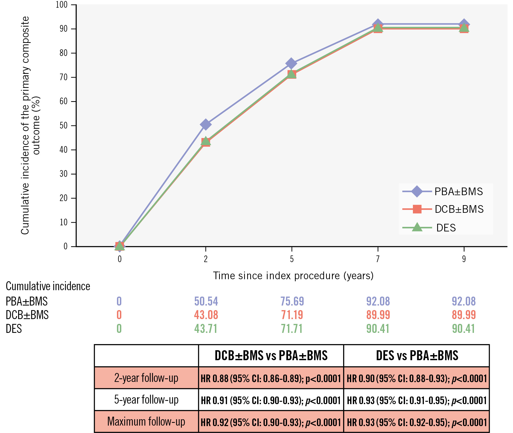 Over a median follow-up period of 5.11 years (interquartile range: 2.88-6.81 years) and a maximum of 9.01 years, the cumulative incidence of the primary outcome was consistently lower in patients treated with DCB±BMS or DES compared with those treated with PBA±BMS.
