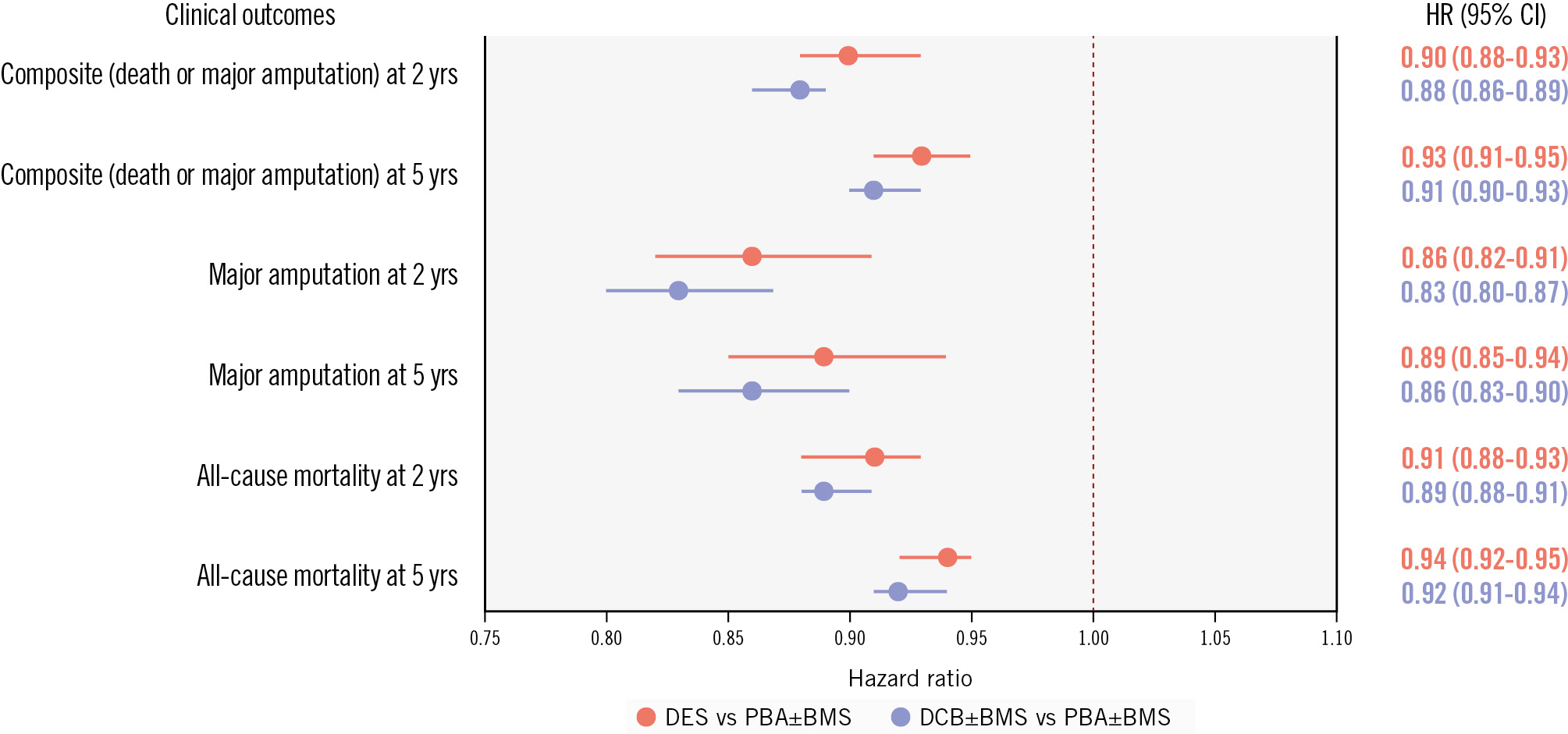 Figure 3. Risk of amputation or mortality with drug-coated versus uncoated endovascular devices at 2 and 5 years in CLTI. BMS: bare metal stent; CI: confidence interval; CLTI: chronic limb-threatening ischaemia; DCB: drug-coated balloon; DES: drug-eluting stent; HR: hazard ratio; PBA: plain balloon angioplasty