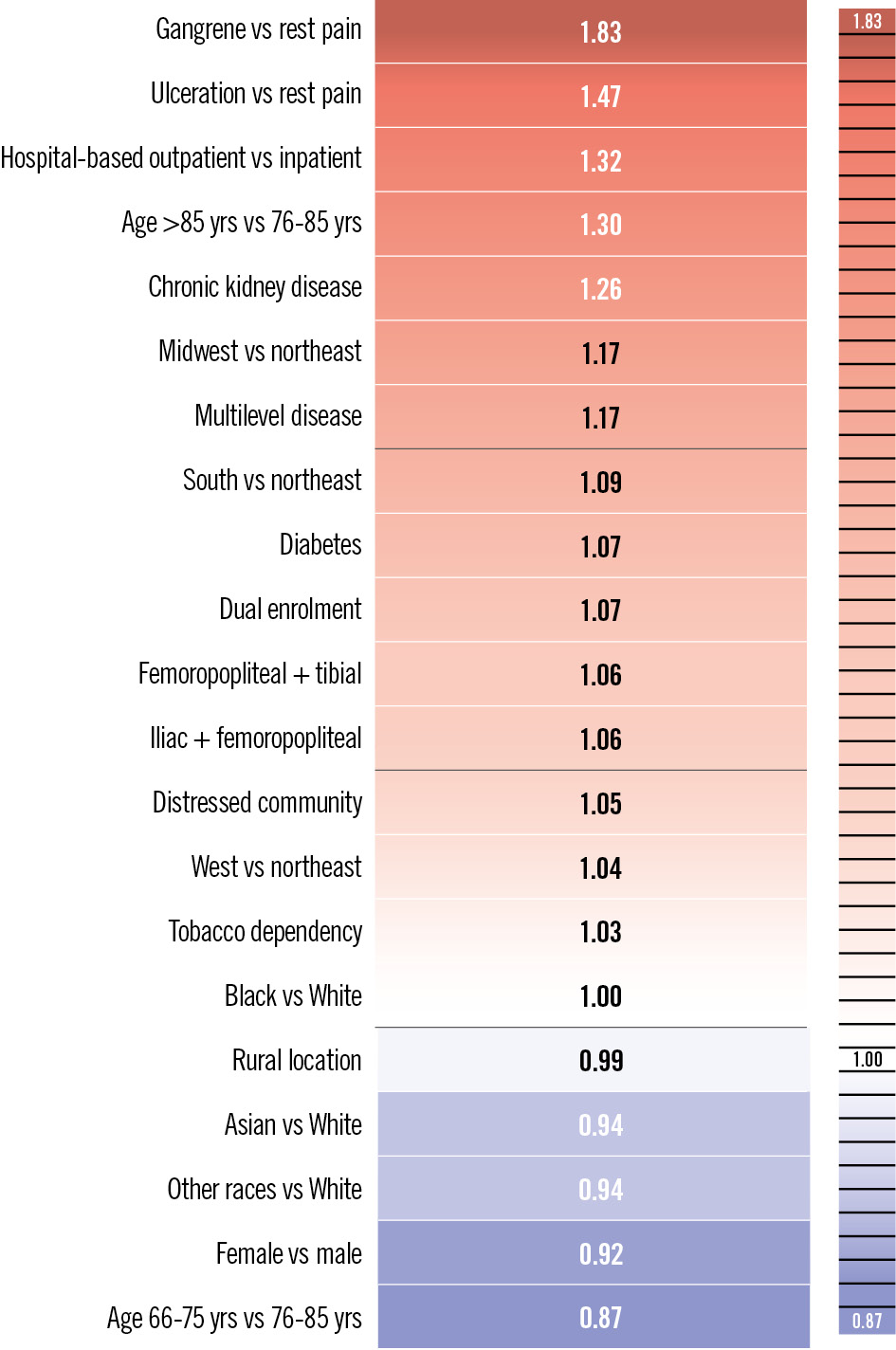 Multivariable Cox regression analyses revealed several patient-level factors independently associated with the primary outcome. Patients aged >85 years had a 30% higher risk of all-cause mortality or major amputation than those aged 76-85 years (adjusted HR 1.30, 95% CI: 1.28-1.33; p<0.0001), while patients aged 66-75 years had a 13% lower risk (vs 76-85 years: adjusted HR 0.87, 95% CI: 0.86-0.89; p<0.0001). Patients of female versus male sex had a lower risk of the primary outcome (adjusted HR 0.92, 95% CI: 0.91-0.93; p<0.0001), while Black versus White race was not significantly associated with the primary outcome (HR 1.00, 95% CI: 0.98-1.02; p=0.8586). Severe ischaemia was a major determinant of prognosis, with patients presenting with gangrene exhibiting nearly double the risk of amputation or death compared with those with rest pain (adjusted HR 1.83, 95% CI: 1.79-1.86; p<0.0001), and for those with ulcers, a 47% elevated risk of the primary outcome (adjusted HR 1.47, 95% CI: 1.44-1.49; p<0.0001). Chronic kidney disease, diabetes, tobacco dependence, and dual enrolment were also associated with worse outcomes (Figure 4).