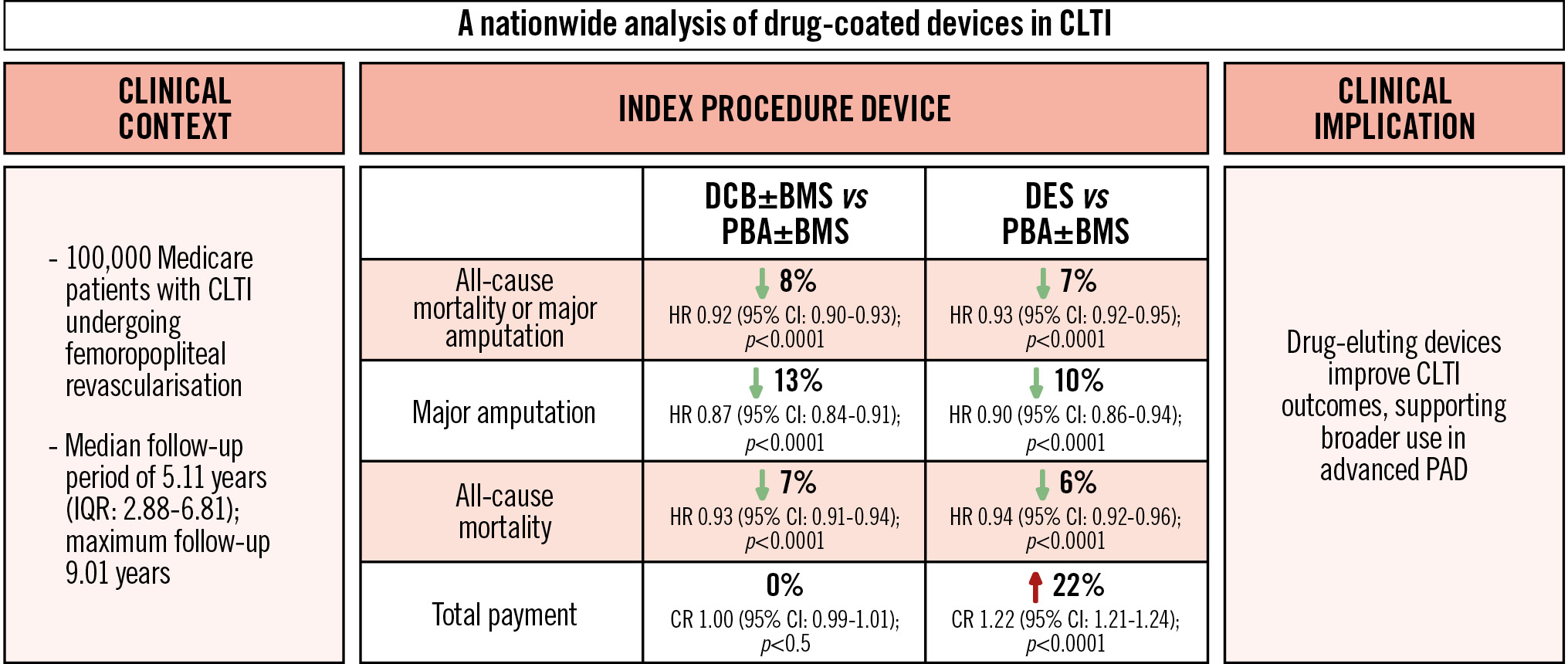 Central illustration. Comparative effectiveness of drug-coated devices for CLTI in a national Medicare cohort. This illustration summarises the comparative effectiveness and economic impact of drug-coated devices in over 100,000 Medicare patients with CLTI compared with treatment with PBA. DCBs and DES were both associated with a reduced risk of major amputation or death. DCBs also reduced reintervention rates and were cost-neutral, while DES showed similar clinical benefit but with increased healthcare costs. These findings support the use of drug-coated devices – particularly DCBs – in femoropopliteal revascularisation for CLTI and highlight the need for personalised, outcome-driven device selection. BMS: bare metal stent; CI: confidence interval; CLTI: chronic limb-threatening ischaemia; CR: cost ratio; DCB: drug-coated balloon; DES: drug-eluting stent; HR: hazard ratio; IQR: interquartile range; PAD: peripheral artery disease; PBA: plain balloon angioplasty