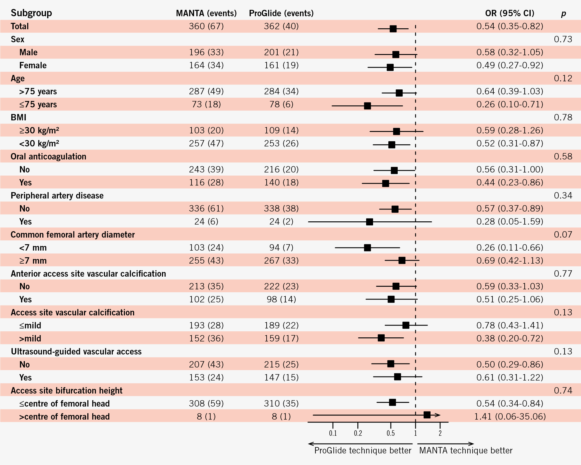 Results: We identified 2 trials that enrolled a total of 722 patients undergoing transcatheter aortic valve implantation. The primary endpoint was significantly less common after vascular closure with the ProGlide-based technique (odds ratio [OR] 0.54, 95% confidence interval [CI]: 0.35-0.82). Access site-related bleeding events were also less common with the ProGlide-based technique (OR 0.41, 95% CI: 0.18-0.94). Prespecified subgroup analyses did not reveal any subgroup favouring the plug-based technique. Clinical outcomes with the MANTA-based technique were better in larger-sized vessels. Patients who received the ProGlide-based technique were less likely to undergo endovascular stenting or vascular surgery (OR 0.22, 95% CI: 0.06-0.79).